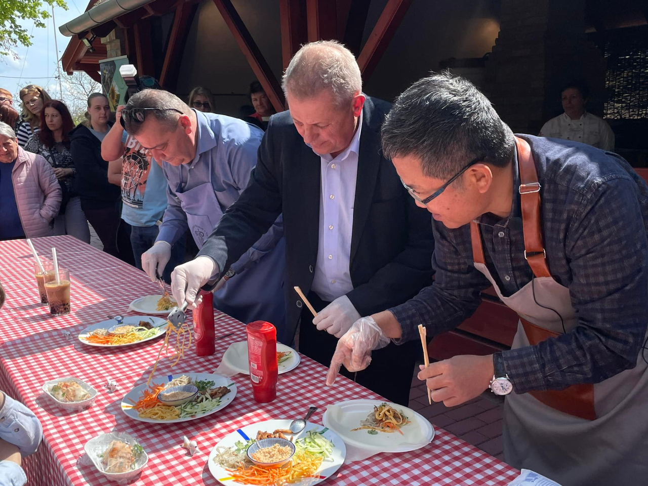 劉大使世忠以匈牙利語向蒂薩祖格居民問候,贏得觀眾熱烈掌聲。劉大使親自示範台南擔仔麵作法後,擁有廚藝界奧運世界冠軍頭銜之副市長愛爾德胥(Hana Erdős)穿上專業廚師服,以現作匈牙利薄餅和台灣潤餅互別苗頭,市長海格杜胥(István Hegedűs)也披上圍裙,接受劉大使邀請和國會議員海爾塞格(Zsolt Herceg)同台包潤餅。