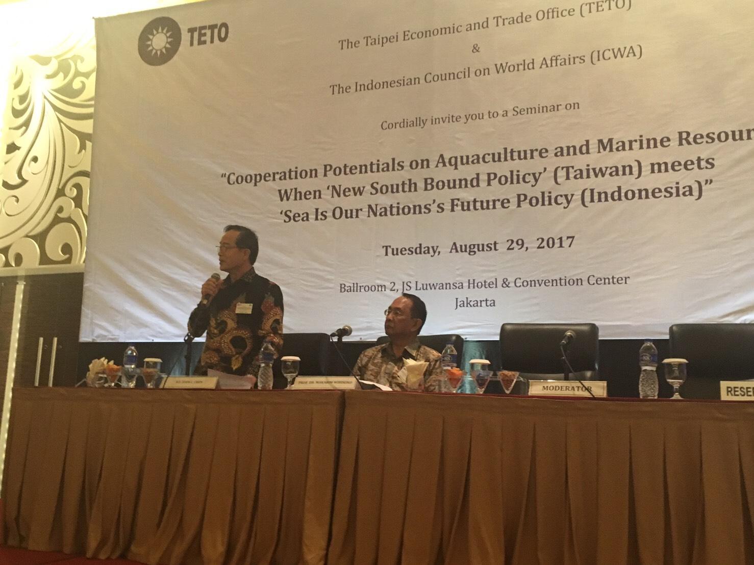 駐印尼代表處與印尼世界事務協會(ICWA)於8月29日共同舉辦「水產養殖與海洋資源合作潛能:當臺灣『新南向政策』遇見印尼『海洋為我國未來政策』研討會」,共同探討臺灣「新南向政策」與印尼海洋漁業部「海洋為我國未來政策」下,水產養殖與海洋資源、技術及投資等合作的潛能,臺印尼產、官、學界的代表應邀出席。