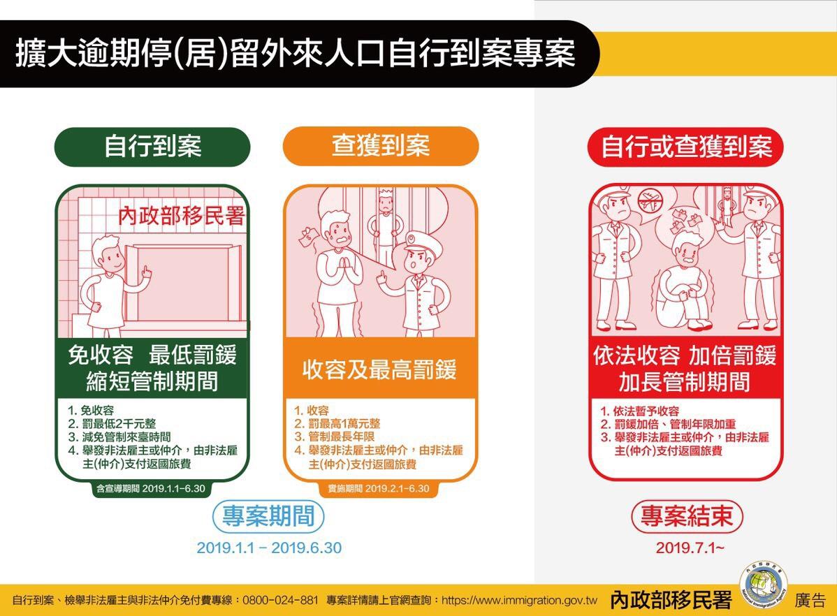 「擴大自行到案」專案期間自今年1月1日至6月30日止,為期半年(含1月份宣導期),專案採取「寬嚴並濟」措施,專案期間「自行到案」者,「從寬」論處,免收容、逾期罰鍰2千元,並且減免禁止入國期間;專案期間「查獲到案」者,「從重」論處,原則ㄧ律收容、逾期罰鍰和禁止入國期間都從重計算;專案「結束」後,修法提高逾期罰鍰,以及延長禁止入國年限。
