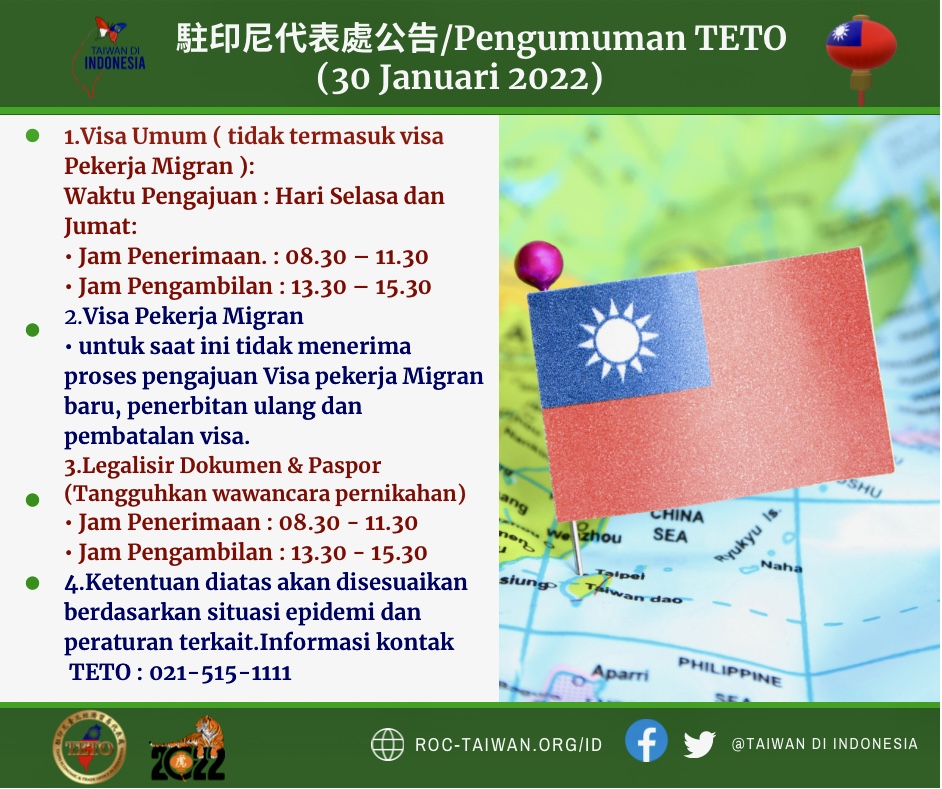 駐印尼代表處領務組自本(2022)年1月31日(一)至2月11日(五)調整對外開放時間 - 駐印尼台北經濟貿易代表處 Taipei Economic and Trade Office, Jakarta, Indonesia ::: 跳到主要內容區塊