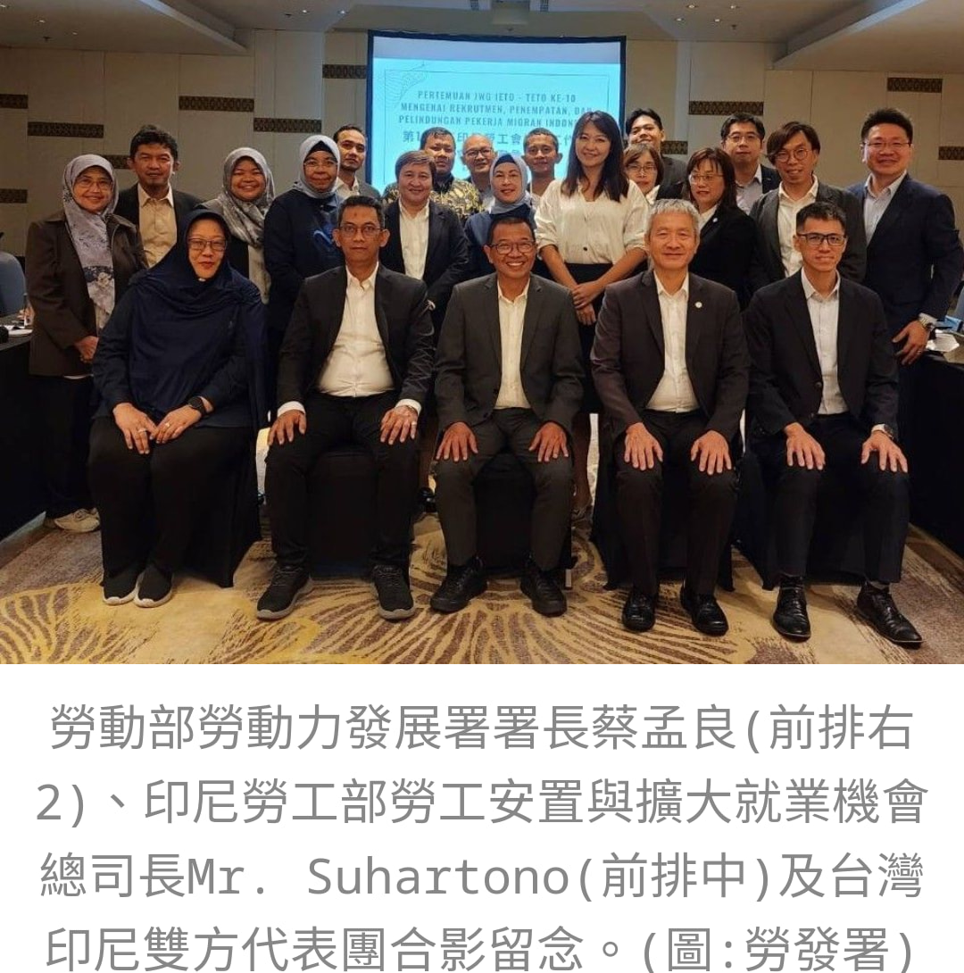 第10屆臺印勞工工作層級會議輪由印方主辦,我方由勞動部勞動力發展署署長蔡孟良應邀率團與會,和印方勞工部勞工安置與擴大工作機會總司Suhartono總司長共同主持,我駐印尼代表處吳慧真組長及駐處人員亦全程與會。蔡孟良署長致詞表示,截至目前在臺工作的印尼移工已有25.9萬餘人,高居所有在臺移工人數首位。印尼移工來臺多從事家庭看護工作,許多在臺工作多年、素質優良、勞雇關係穩定的印尼移工,深受我國雇主喜愛,雇主並主動轉任為中階技術人力,近1年以來已有近6,700名印尼移工轉任中階人力,其中家庭看護移工就占9成,雇主獲得優質人力、移工則得到更高薪資待遇,不但協助解決我國人力短缺問題,對我國經濟與社會發展貢獻良多。印尼Suhartono總司長則表示,臺灣政府保障移工權益相當完善,加上雇主與移工相處十分友善,所以有更多的印尼移工選擇到臺灣工作,而臺方新推出的留才久用方案,將能創造更多資深印尼移工的工作機會及更好的待遇,印方會積極與臺方共同推動「移工留才久用」方案。