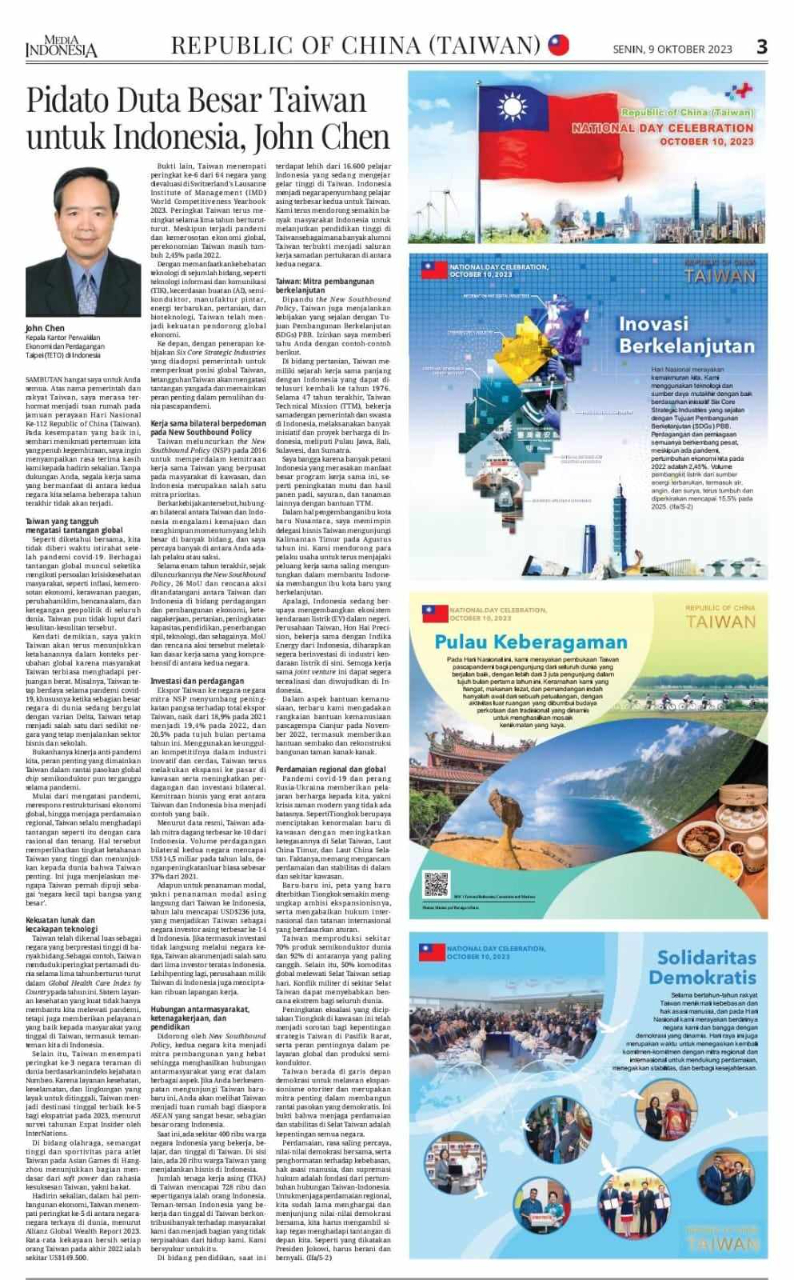 印尼媒體報(MEDIA INDONESIA)刊登專文慶祝中華民國112年國慶 - 駐印尼台北經濟貿易代表處 Taipei Economic and Trade Office, Jakarta, Indonesia ::: 跳到主要內容區塊