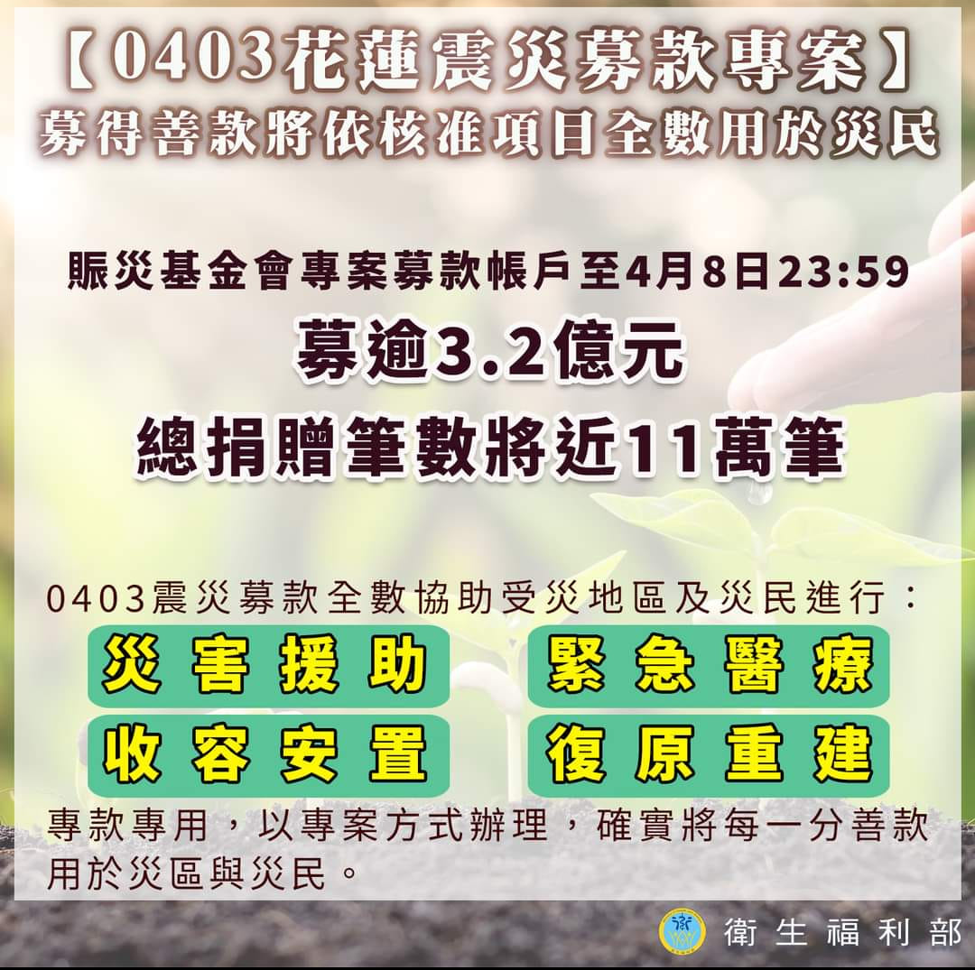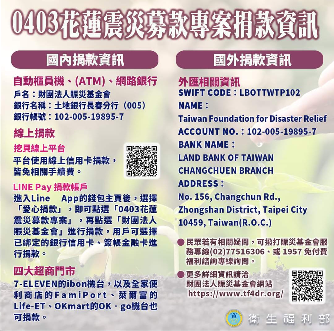 Dalam rangka menggabungkan upaya pemerintah dan swasta untuk membantu masyarakat yang terkena dampak gempa bumi Hualien 0403, Eksekutif Yuan Taiwan telah menginstruksikan “Taiwan Foundation for Disaster Relief” di bawah Kementerian Kesehatan dan Kesejahteraan Taiwan untuk mengumumkan rekening sumbangan. Donasi dari dalam negeri dan luar negeri akan diterima dengan periode penggalangan dana mulai dari tanggal 4 April hingga 3 Mei 2024 yang berlangsung selama satu bulan. Sumbangan akan digunakan untuk membantu daerah-daerah yang dilanda bencana dan para korban bencana, perawatan medis darurat, tempat tinggal dan pemukiman kembali, proyek-proyek pemulihan dan rekonstruksi, serta untuk mengatasi kesulitan akibat bencana. Bagi masyarakat luar negeri yang tertarik untuk berdonasi, bisa melalui cara berikut ini.