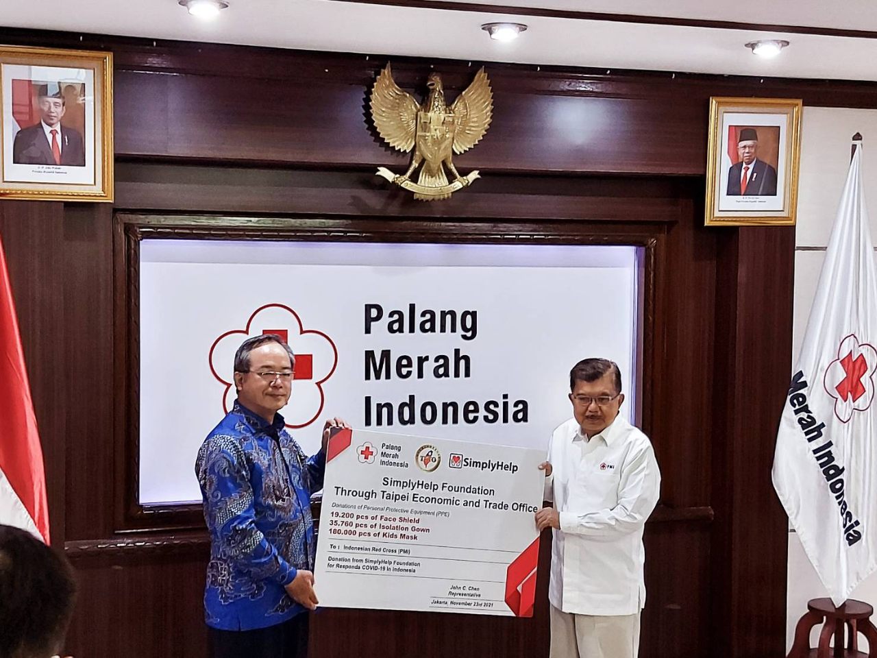 Duta Besar Chen Chung dari kantor Perwakilan Taiwan di Indonesia pada tanggal 23 November 2021 mewakili organisasi non-pemerintah yang didirikan diaspora Taiwan di Amerika "SimplyHelp Foundation" mendonasikan sejumlah perlengkapan pencegahan pandemi kepada Palang Merah Indonesia (PMI). Acara serah terima donasi berlangsung sederhana namun megah dan diterima langsung oleh ketua umum PMI H.M. Jusuf Kalla.