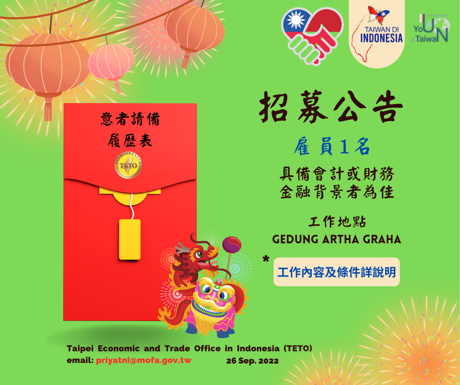 Anyone interested in this job, please submit Chinese, English and Indonesian resume to Priyatni@mofa.gov.tw with subject “Job Application Staff Assistant”.