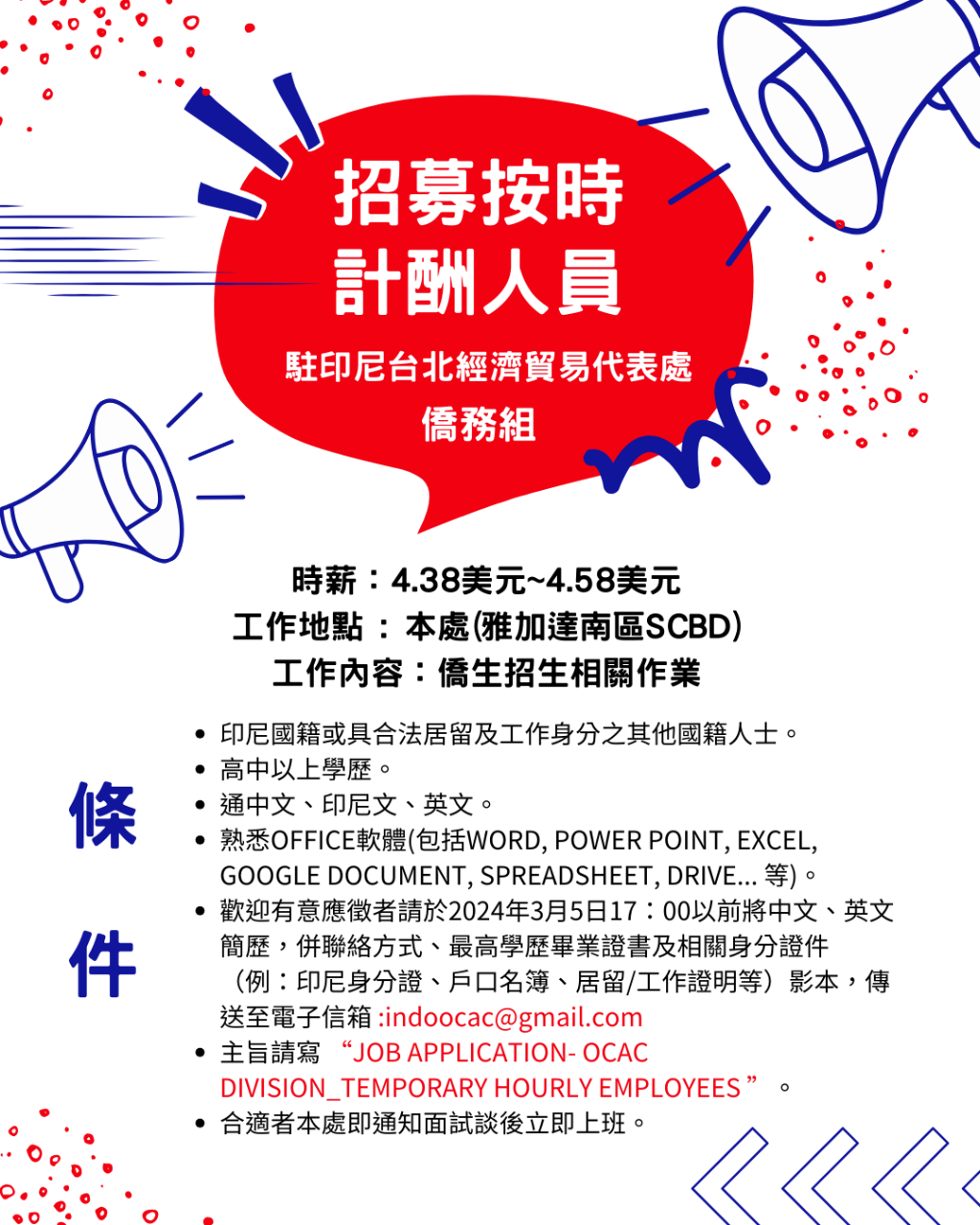 ● Interested applicants are welcome to send the following to indoocac@gmail.com with subject “Job Application- OCAC Division_Temporary hourly employees” by 17:00, 5 MAR 2024: