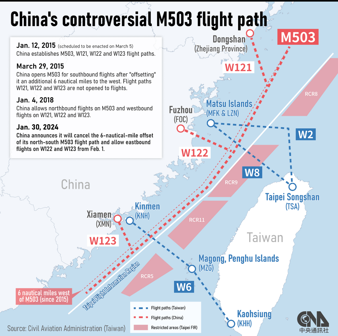 Bagian 4.2.6 dari “Manual Perencanaan Layanan Lalu Lintas Udara” ICAO menetapkan bahwa perubahan terhadap jaringan penerbangan apa pun harus dikoordinasikan dengan semua wilayah informasi penerbangan yang berdekatan. “Wilayah Informasi Penerbangan Matsu Taiwan” berbatasan dengan rute penerbangan W122, dan “Wilayah Informasi Penerbangan Kinmen Taiwan” berbatasan dengan rute penerbangan W123 dengan titik terdekat hanya berjarak 1,1 mil. Namun, Tiongkok mengumumkan perubahan pada jaringan penerbangan tersebut tanpa berkonsultasi terlebih dahulu dengan Administrasi Penerbangan Sipil Taiwan, yang merupakan satu-satunya otoritas yang bertanggung jawab atas “Wilayah Informasi Penerbangan Taiwan”. Hal ini merupakan pelanggaran serius terhadap peraturan ICAO dan menggarisbawahi sifat otoriter Tiongkok yang tidak bertanggung jawab.