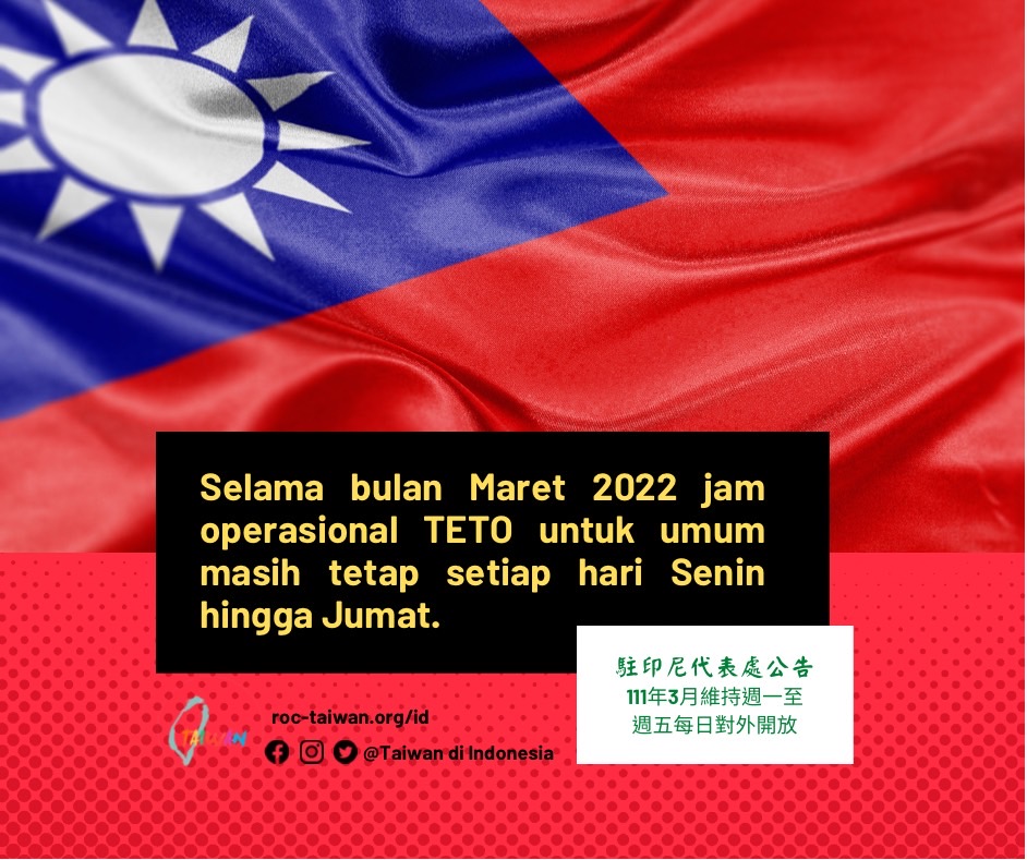 Selama bulan Maret 2022 jam operasional TETO untuk umum masih tetap setiap hari Senin hingga Jumat. Jam operasional Divisi Konsuler adalah pukul 08.30 - 15.30 WIB, sedangkan divisi lainnya beroperasi pukul 10.00 - 15.30 WIB.