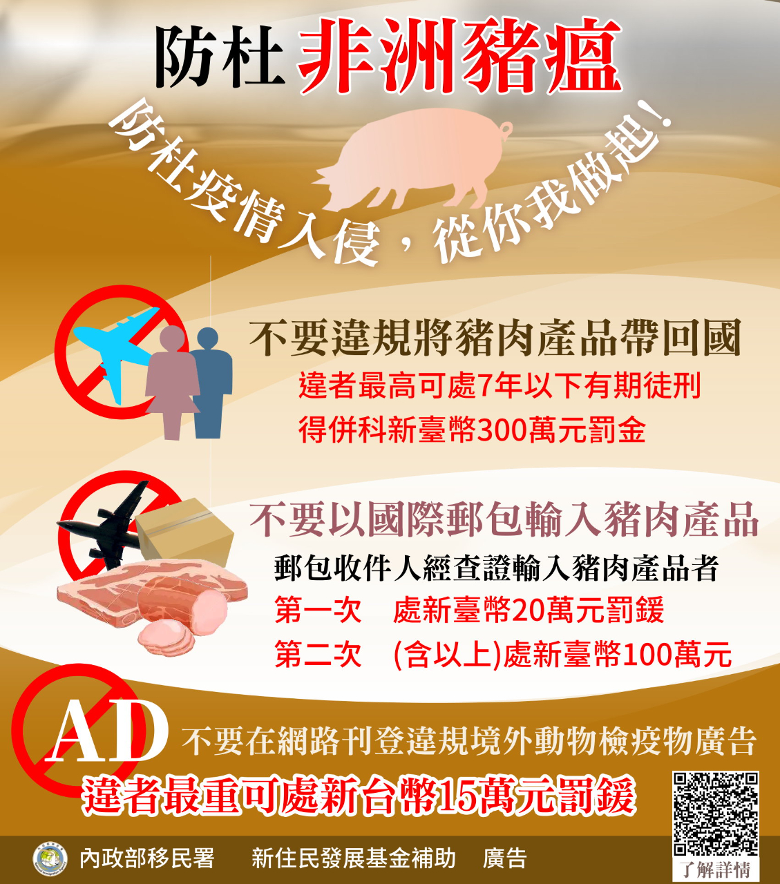 農曆春節將屆,再次提醒所有入境我國旅客,千萬不要攜帶肉類產品,亦不得以郵遞寄送豬肉產品等動物檢疫物到臺灣,以免受罰。