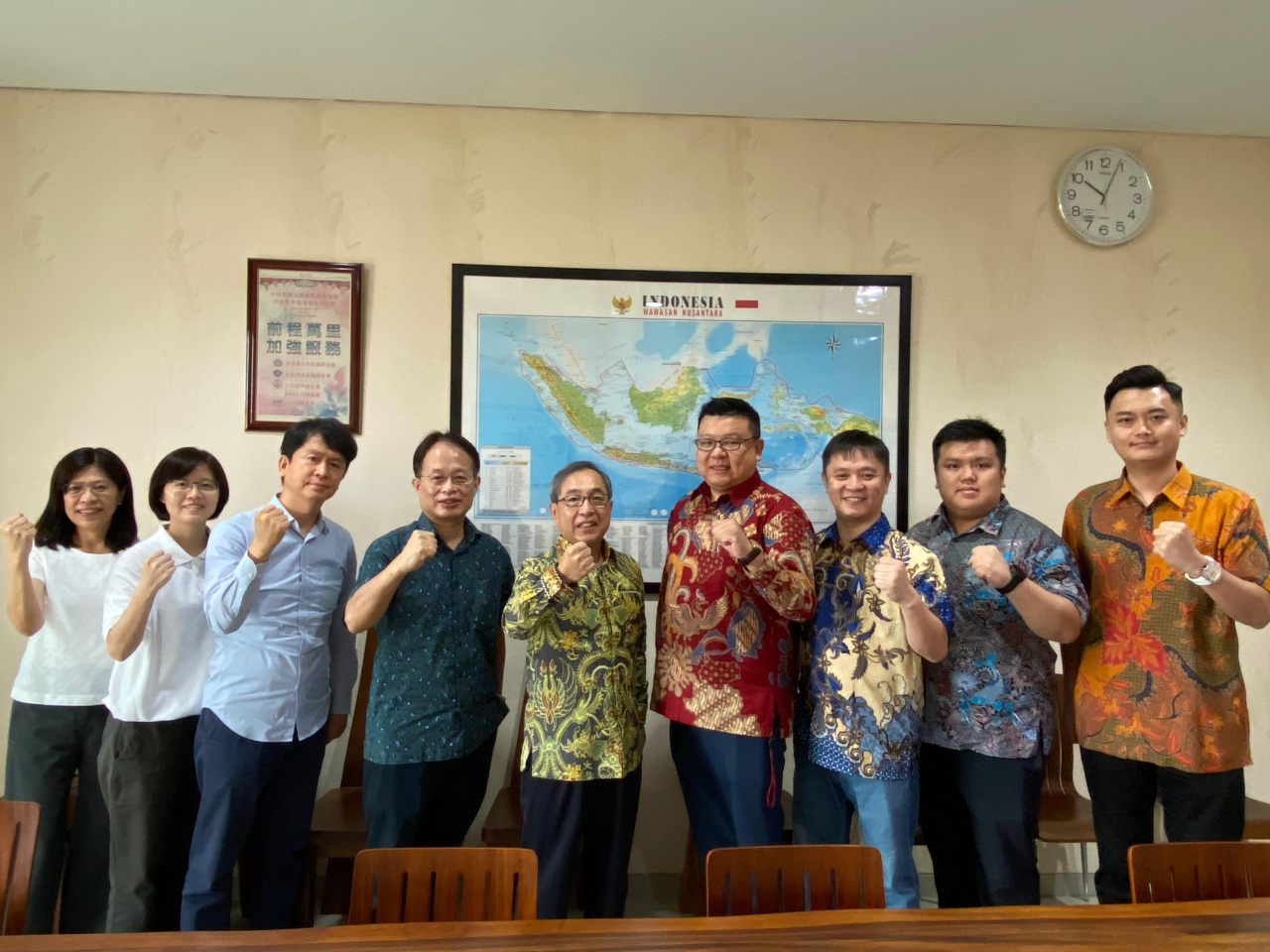 邱處長指出,駐泗水辦事處亦加強透過我國大學網絡,例如在此間擁有眾多校友的國立台灣科技大學,針對本地市場需求,引介相關技術,促成雙邊產業鏈結,例如近期協助此間企業對接我國有關廢塑轉換為燃料的技術,有助本地綠產業及循環經濟發展,極具前瞻遠景,亦盼泗水台商會及相關台資廠企共同參與。