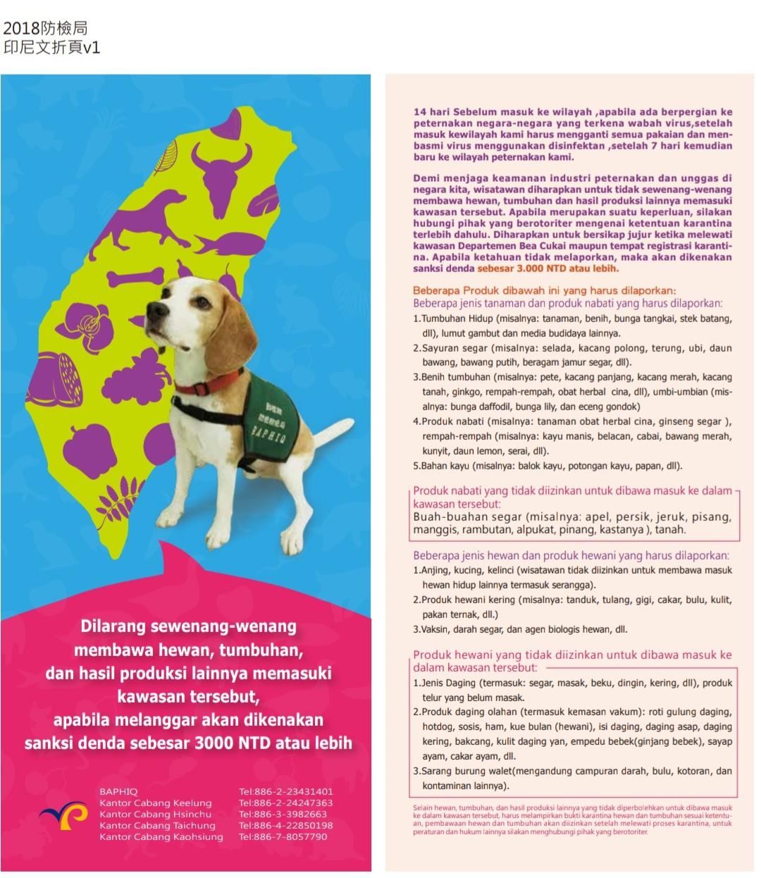 Dilarang membawa hewan, tumbuhan, dan hasil produksi (termasuk produk daging, contohnya rendang daging sapi) lainnya memasuki Taiwan. Apabila melanggar akan dikenakan sanksi denda lebih dari NTD 3,000 sampai sebesar NTD 1 juta (sekitar Rp. 470 juta).