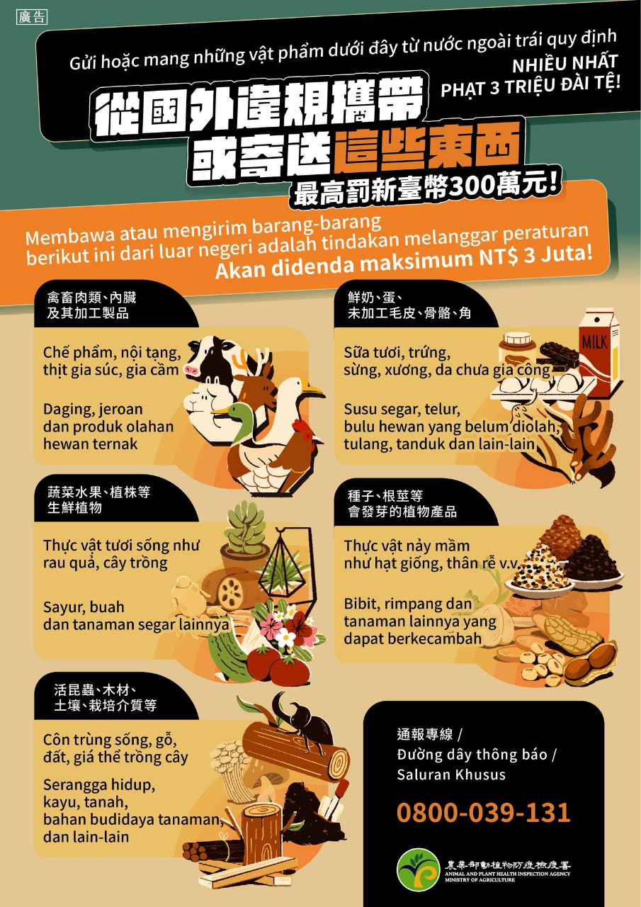 Membawa atau mengirim barang-barang berikut ini dari luar negeri ke Taiwan adalah tindakan melanggar peraturan akan didenda maksimum NT$ 3 Juta!