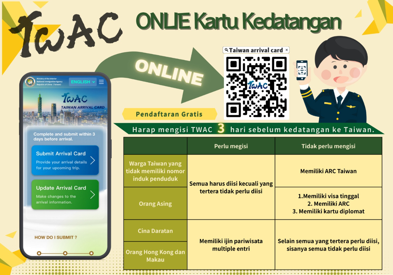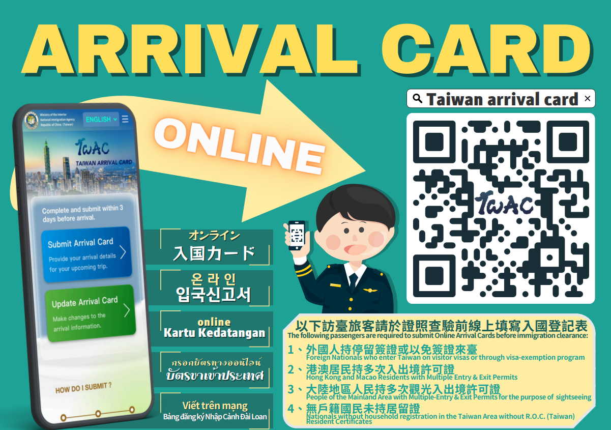 Mulai 1 Oktober 2025, Taiwan secara resmi akan menerapkan TAIWAN ARRIVAL CARD (TWAC). Wisatawan asing dapat mengunjungi situs web resmi TWAC Departemen Imigrasi (https://twac.immigration.gov.tw) untuk mengajukan permohonan secara online dalam waktu tiga hari sebelum tiba di Taiwan, setelah melengkapi informasi, sistem akan secara otomatis mengirimkan surat keterangan permohonan yang berhasil ke alamat email wisatawan, sehingga wisatawan tidak perlu menunjukkan surat keterangan tersebut kepada petugas pemeriksaan saat memasuki negara tersebut. Saat memasuki Taiwan, wisatawan tidak perlu menunjukkan sertifikat deklarasi kepada petugas pemeriksaan. Setelah petugas pemeriksaan paspor, sistem akan secara otomatis menampilkan informasi TWAC yang telah diisi .