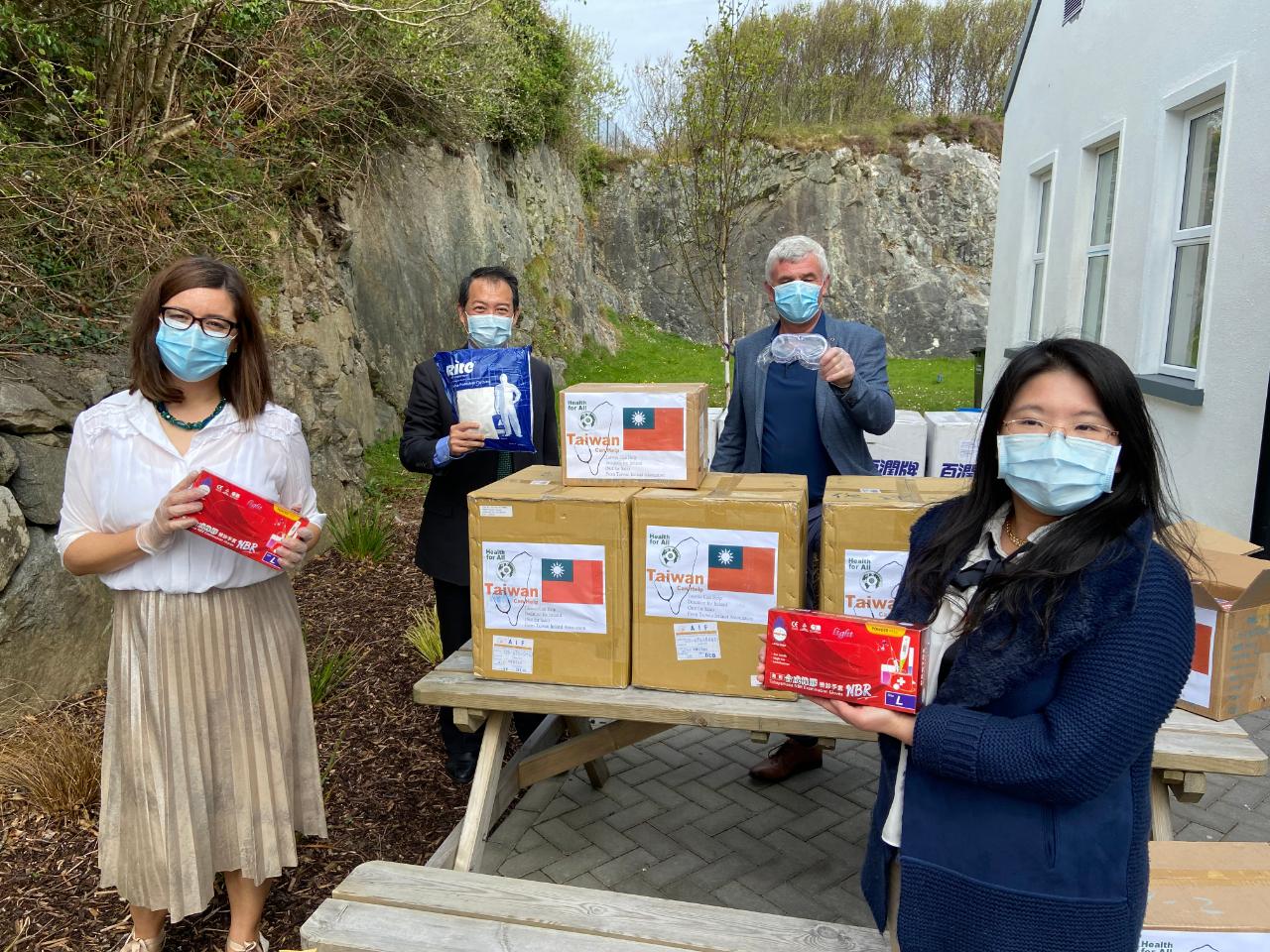 第二批由台灣出口的12,500雙醫用手套、400副醫療護目鏡及300件防護衣日前運抵愛爾蘭西部大城高威(Galway)市,並於4月22日在駐愛爾蘭代表楊子葆與前任參議員帕特里·歐西迪(Padraig O Céidigh)見證下,由愛爾蘭台灣協會會長鄭惠文捐贈給「卡斯拉護理之家」(Casla Home Care)代表艾茉‧尼爵迪(Emer Ni Cheidigh),提供該協會長照機構「台灣製造」的保護。