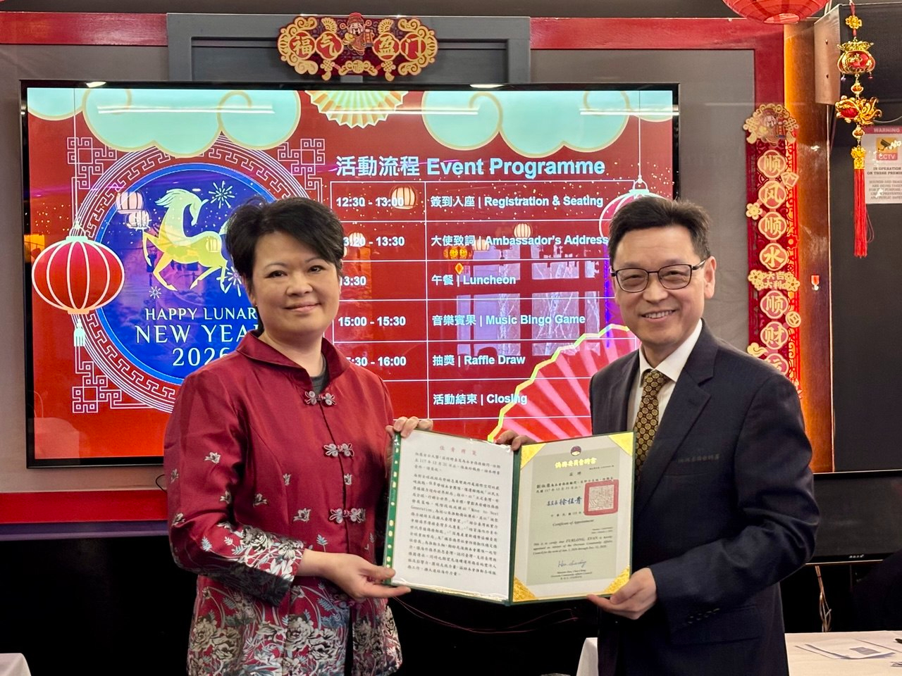 唐大使致詞時首先感謝「愛爾蘭台灣協會」用心籌辦活動,讓在愛爾蘭生活的台灣朋友們感受年節溫暖,也讓當地朋友有機會體驗台灣年味。唐大使並藉此歡聚場合,轉致僑務委員會徐佳青委員長頒予僑務顧問劉淑慧,以及僑務促進委員暨愛台協會會長林聖諭的聘書與賀函,期許台灣在愛社群持續透過多元活動交流互助,深化台愛人民之間的認識與情誼。唐大使最後也祝福大家新年快樂、安康如意。