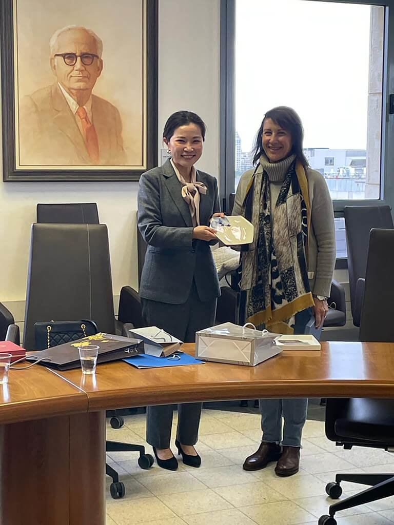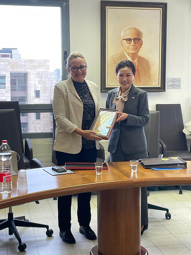 駐以色列代表李雅萍(右)與特拉維夫大學副校長謝米爾(Milette Shamir)相互贈禮。
