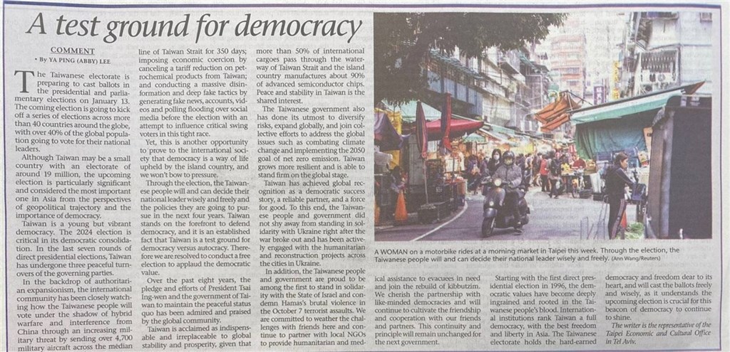駐以色列代表李雅萍接受以色列最大英文報「耶路撒冷郵報」(The Jerusalem Post) 邀稿,以「民主試驗場」為題撰文,於12日刊出,闡述台灣大選對鞏固民主很重要。