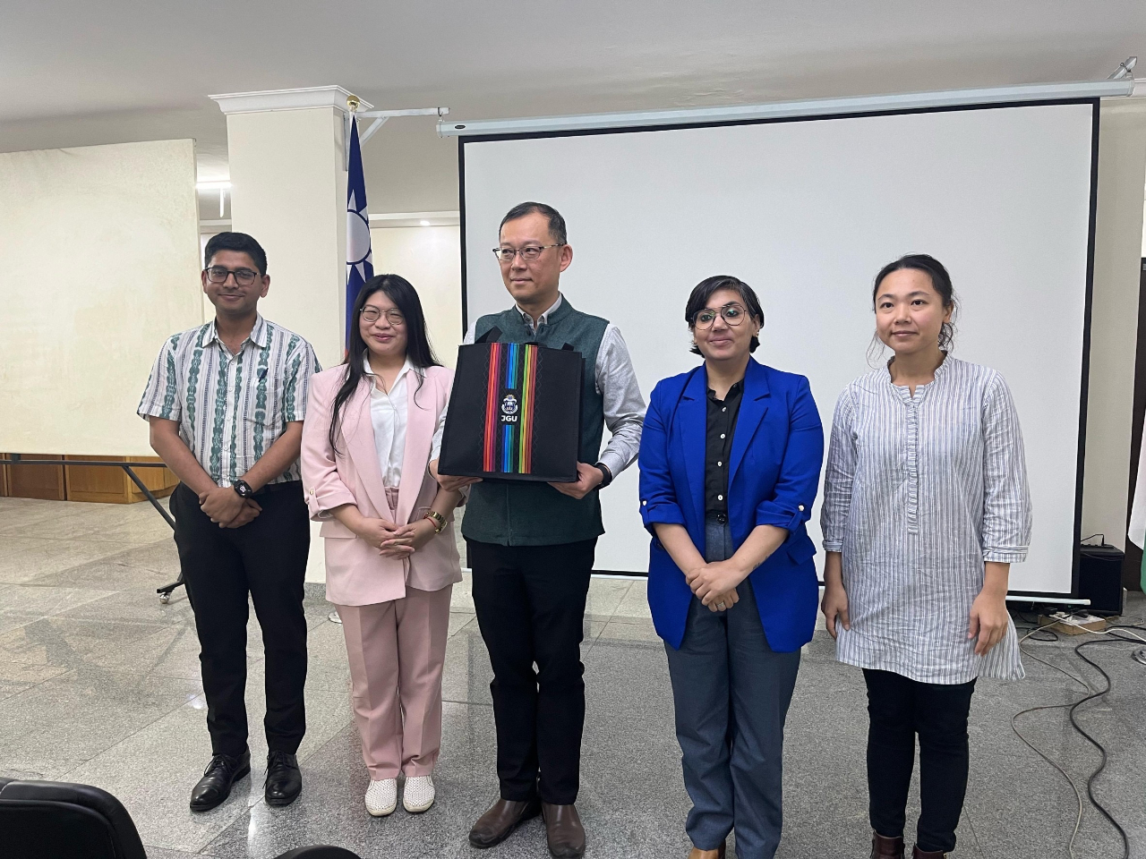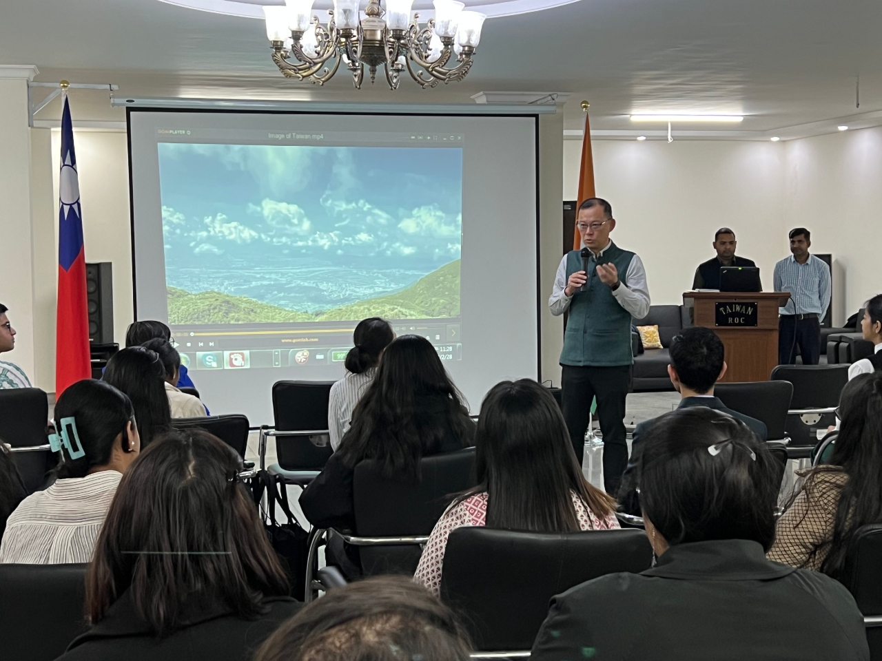 陳公使首先播放親自拍攝之台灣山林美景,以自行車好手悠遊視角,向Jindal大學師生簡介台灣歷史、地理、政治、認同、經貿及文化,並以人口規模及紅利等生動對比,鼓勵印度學生累積學習華語成果,赴台深造,投入雙邊學術、產業等各領域,成為文化橋樑。簡報結束學生並詢問有關區域地緣政治及教育交流問題。本處教育組雇員Sakshi則以詳細分類說明台灣教育中心推動成果及申請各項獎學金申請流程。