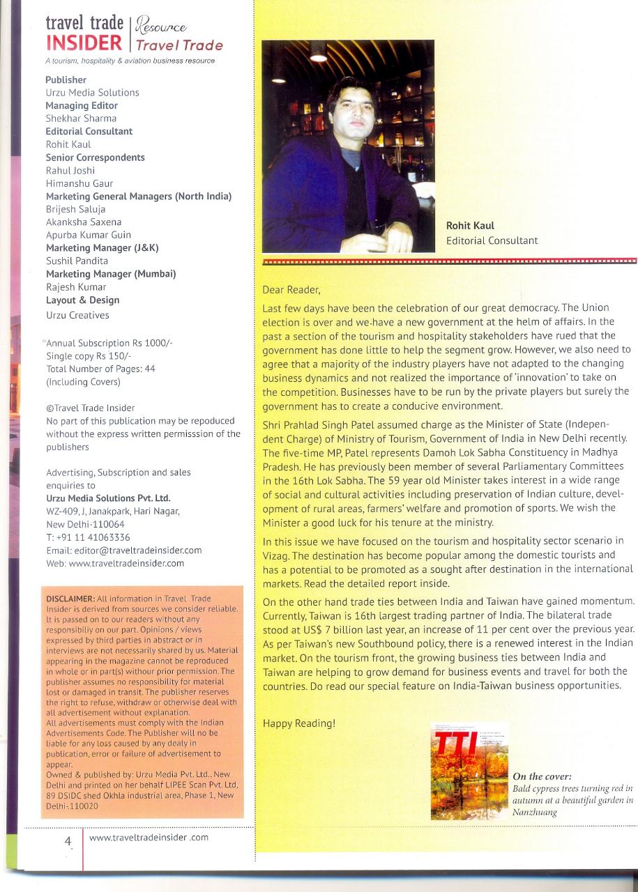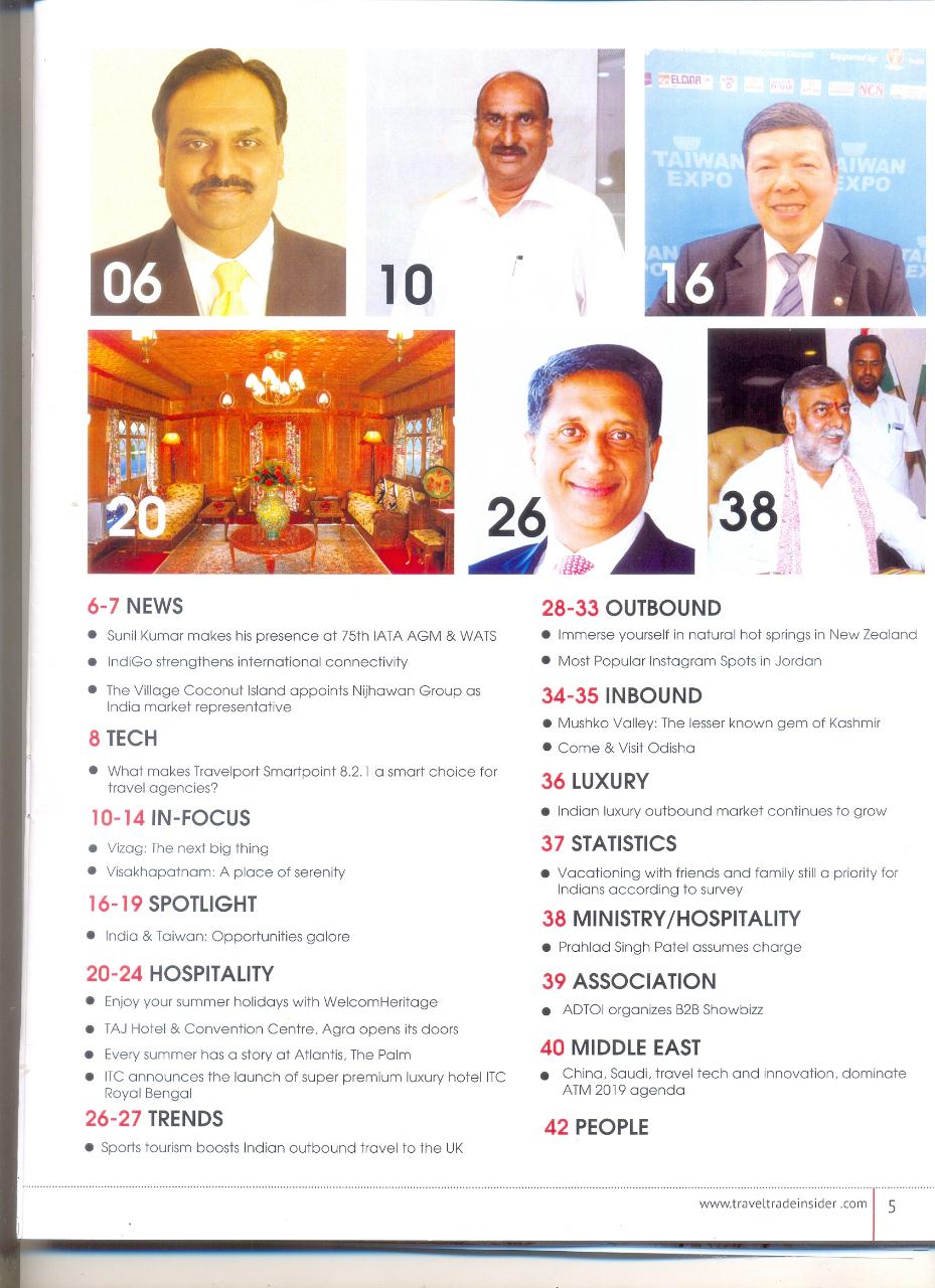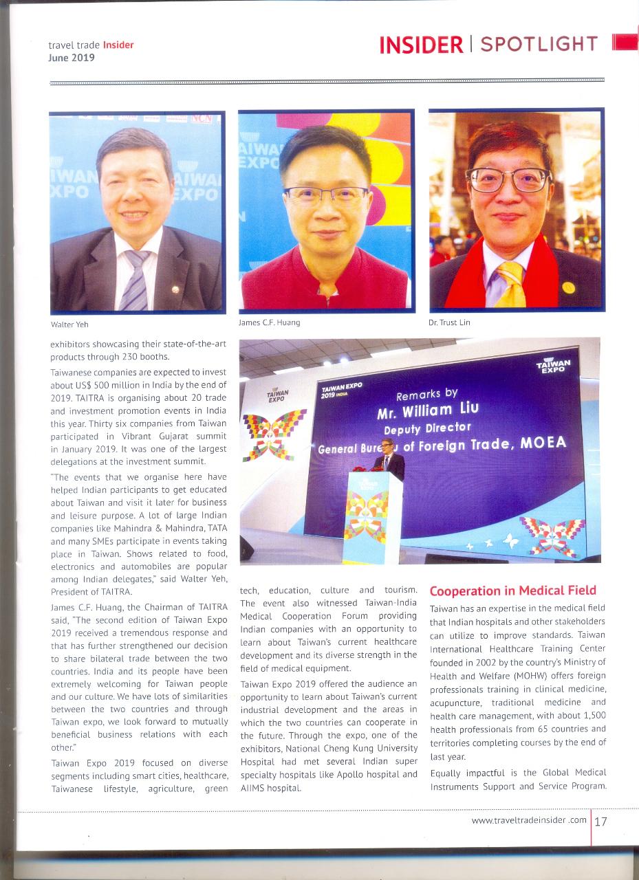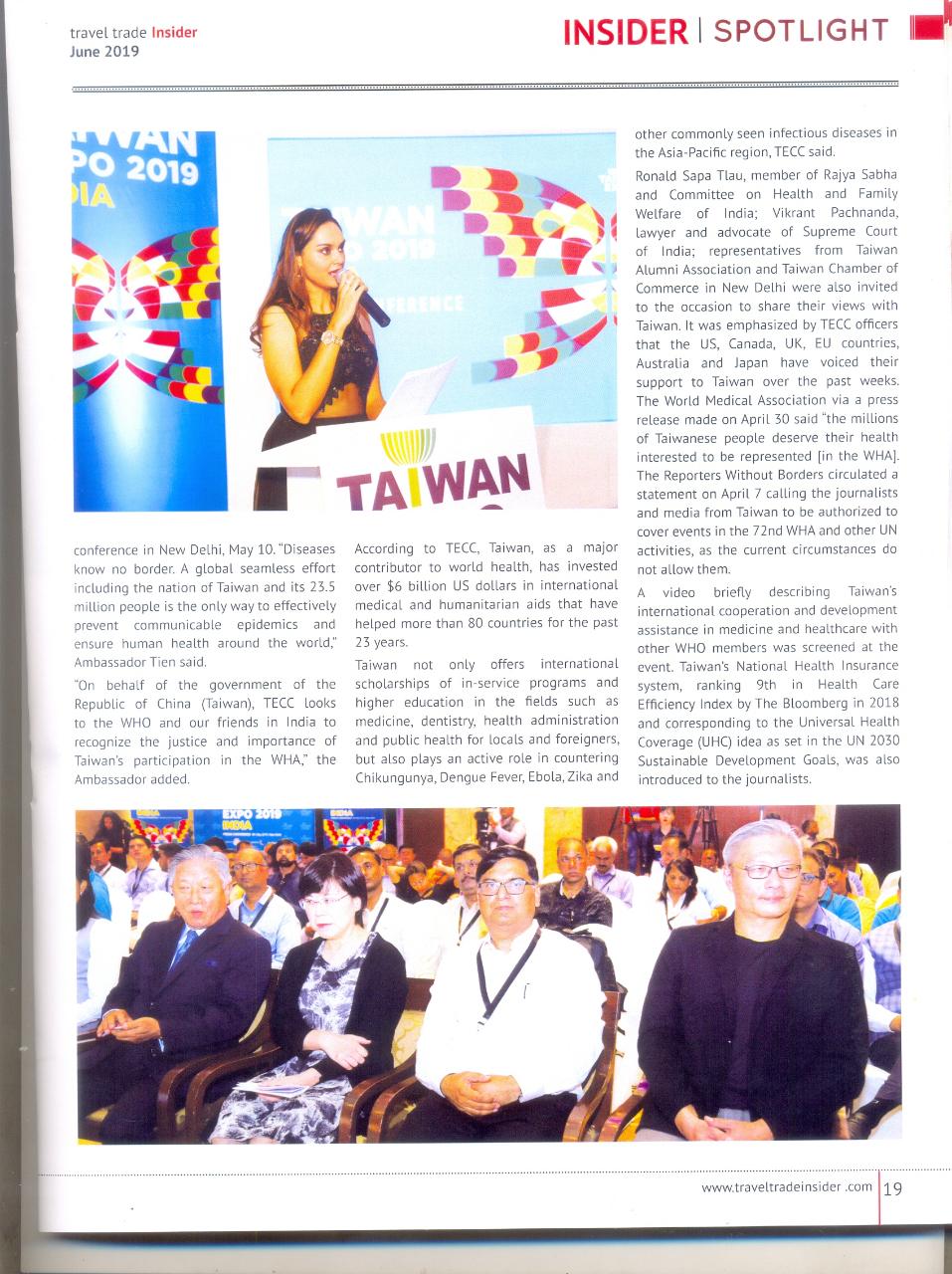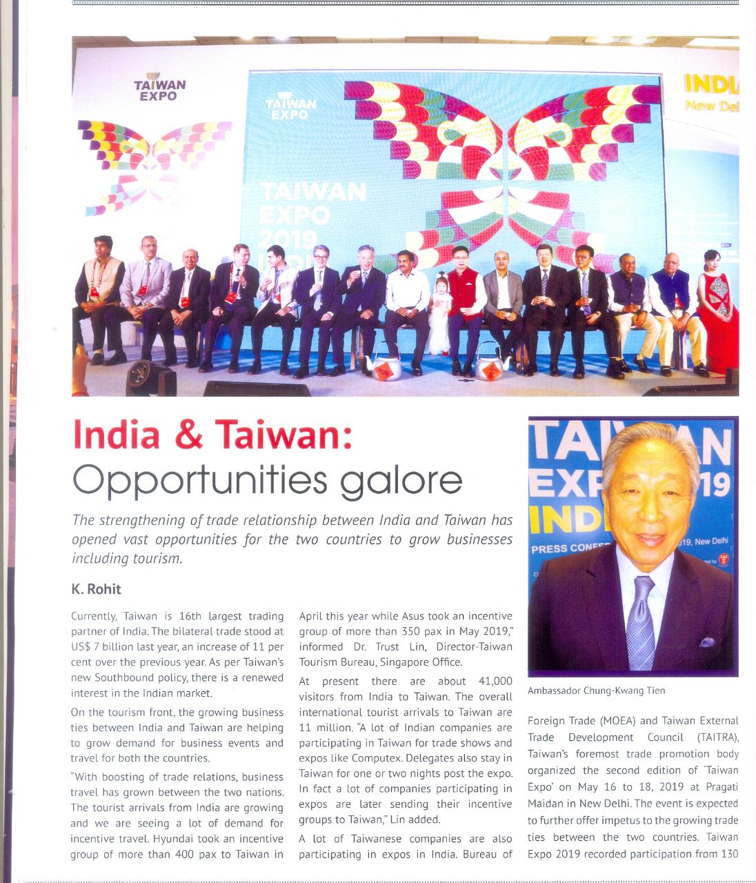 "Travel Trade Insider" magazine in India featured a special report on the developments of Taiwan-India relationship in its latest issue of June, 2019. The main points are as below: