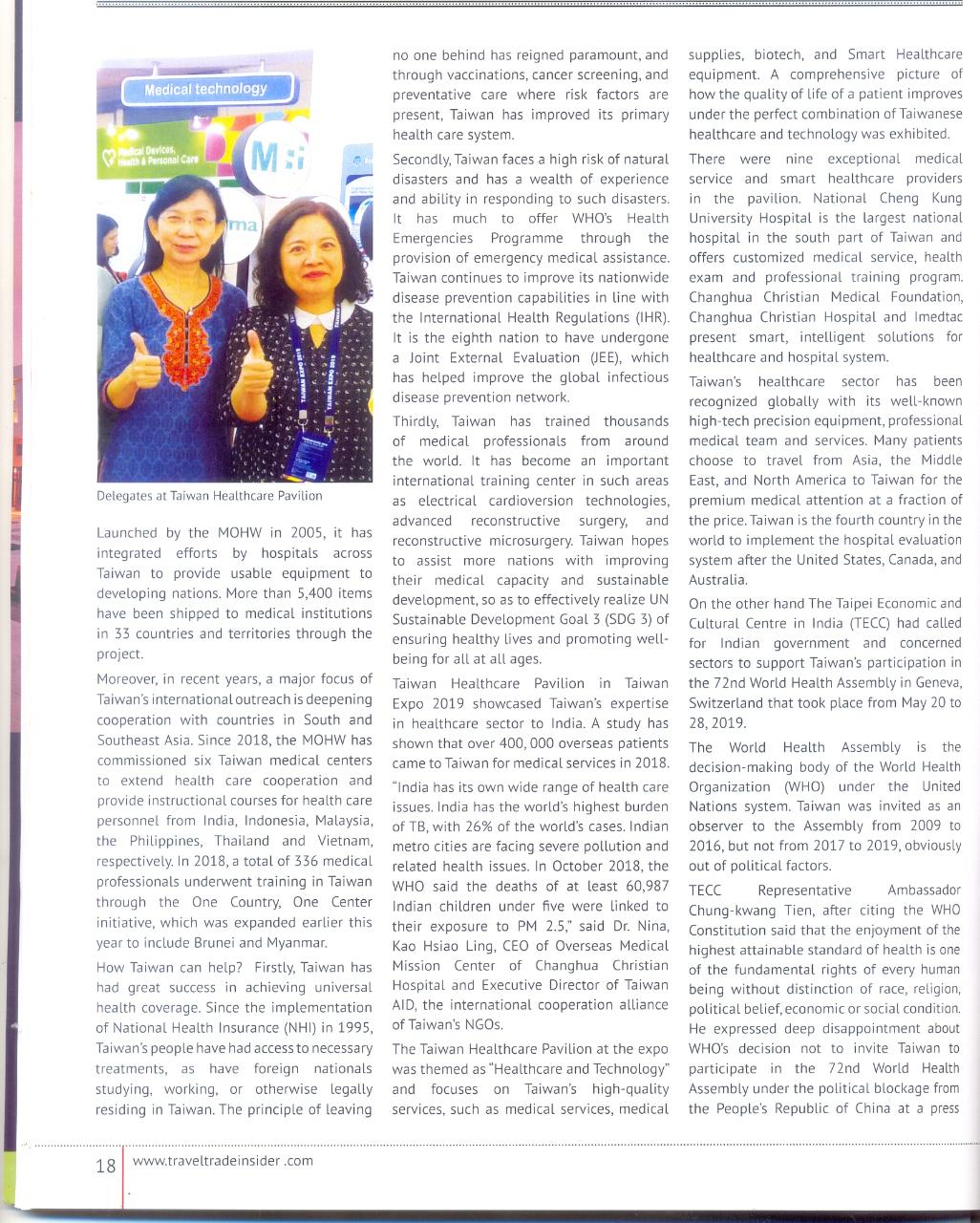 - Besides its diversified focus on Smart Cities, agriculture, green tech, education, culture and tourism, “Taiwan Expo” in 2019 also provided an opportunity for Indian companies to learn about Taiwan’s current healthcare development and its strength in the field of medical equipment.