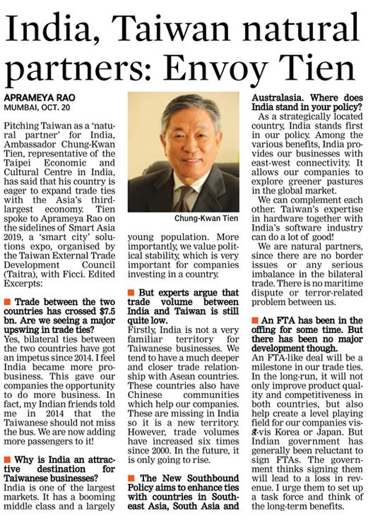 Amb. Chung-kwang Tien, Representative of Taipei Economic and Cultural Center in India, said Taiwan and India are natural partners and should consider singing a Free Trade Agreement (FTA) on the sidelines of Smart Asia 2019 held in Mumbai from Oct. 17 to 19.