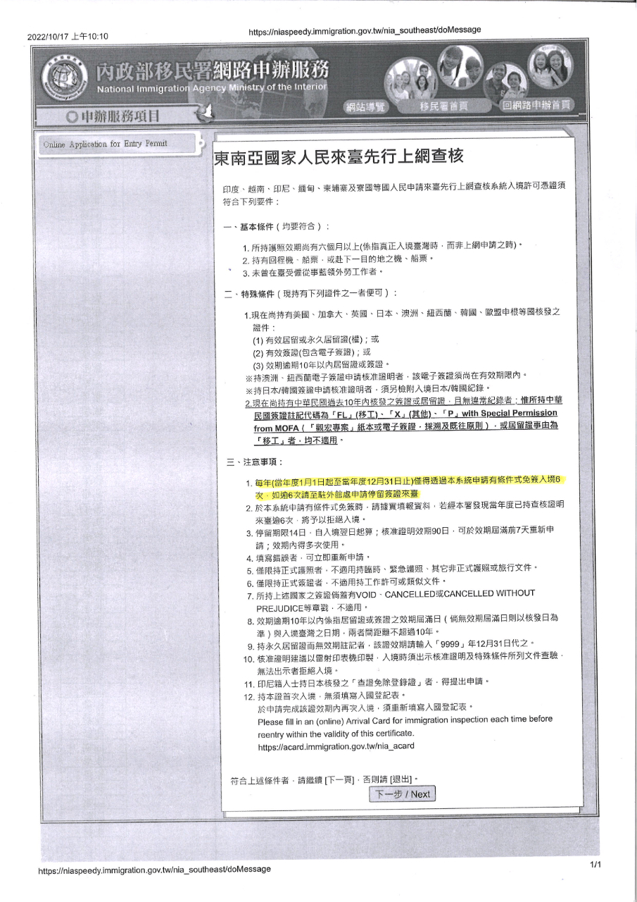 東南亞國家人民來台先行上網查核入境許可證本年新增每年不得使用超過六次之規定。 - 駐清奈臺北經濟文化辦事處 Taipei Economic and Cultural Center in Chennai ::: 跳到主要內容區塊