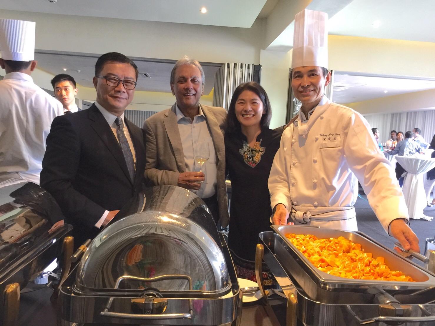 斯里蘭卡國慶餐會場景(圖片說明:左一:駐清奈辦事處處長李朝成、左二:斯里蘭卡喜瑪仕集團(Hemas Group)董事阿巴斯(Abbas Esufally)、右二:斯里蘭卡台灣友誼協會發起人張美燕女士,右一:台北君悅大飯店特約主廚宋瓊宏老師)