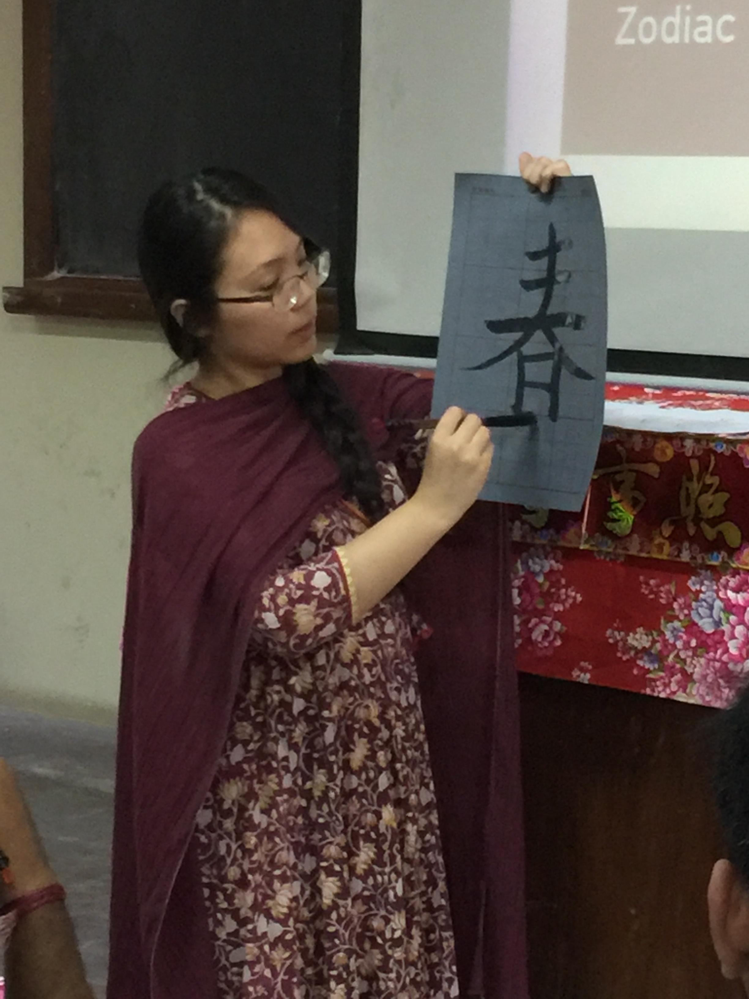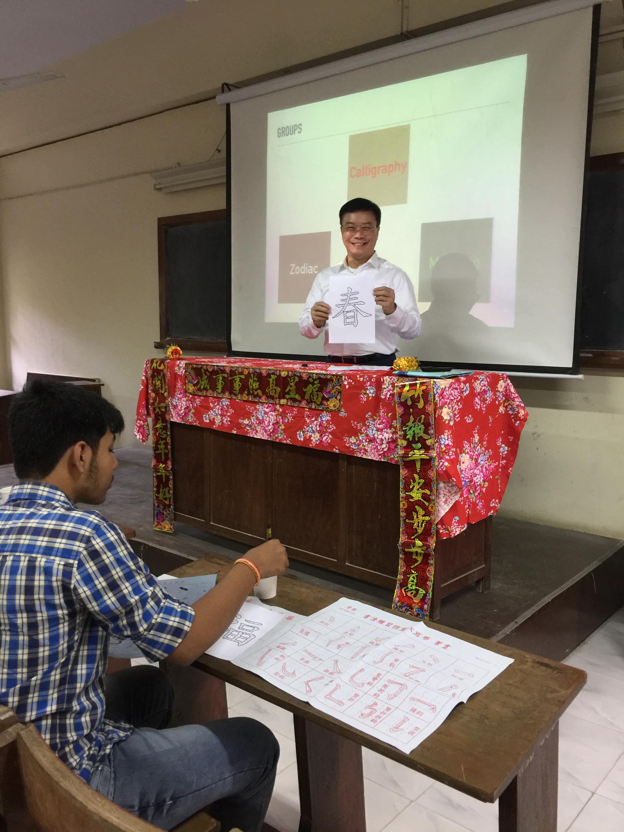 駐清奈辦事處李朝成處長應邀參加此項活動,除回答多位同學有關文字部首、發音、書寫順序等資訊外,並於致詞時補充說明在台灣部分家庭在除夕夜及大年初一尚有祭祀祖先及送迎神明之傳統,以及誠心擲筊與祖先、神明直接溝通的方式與意涵,同學們聽得興意盎然。