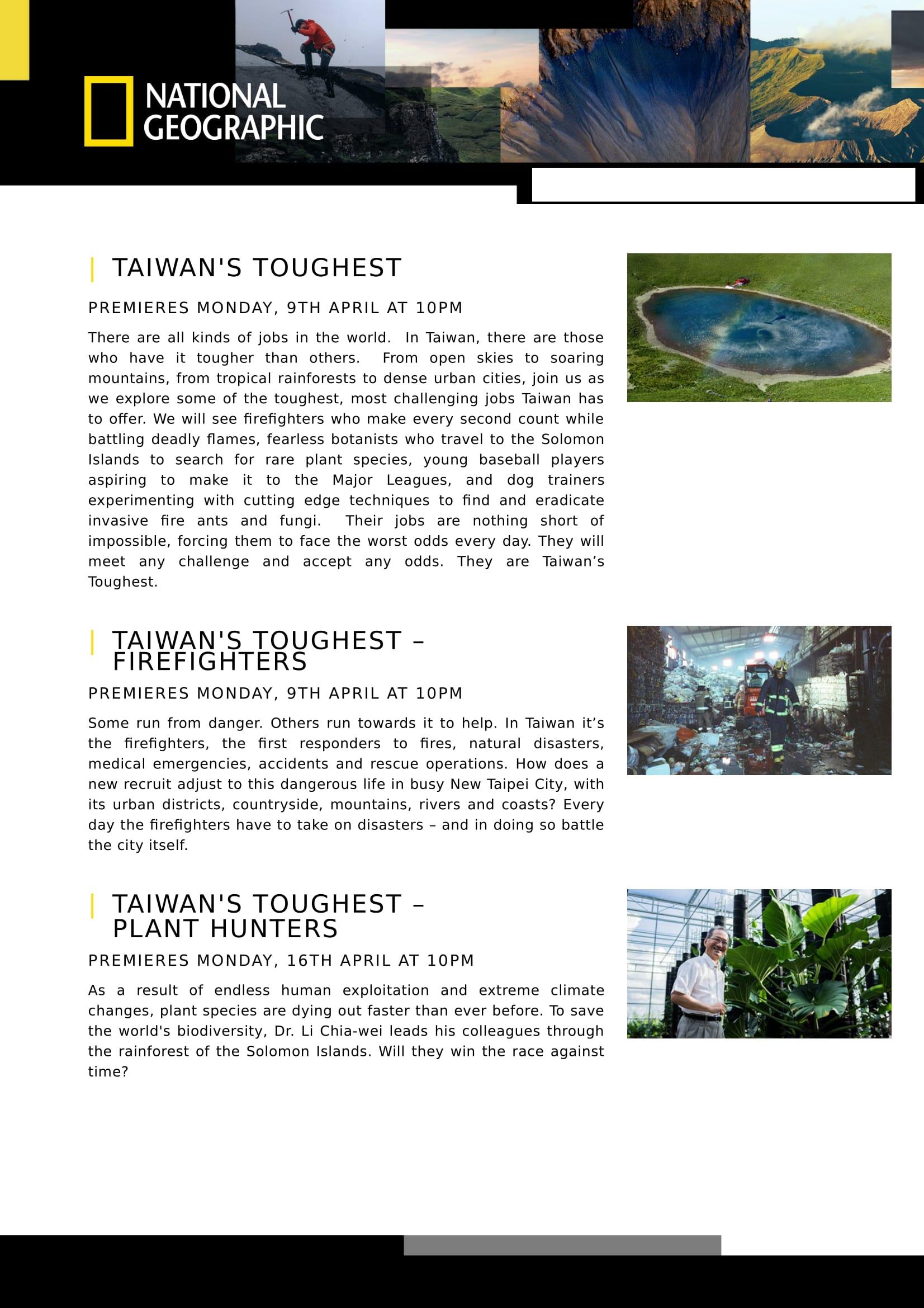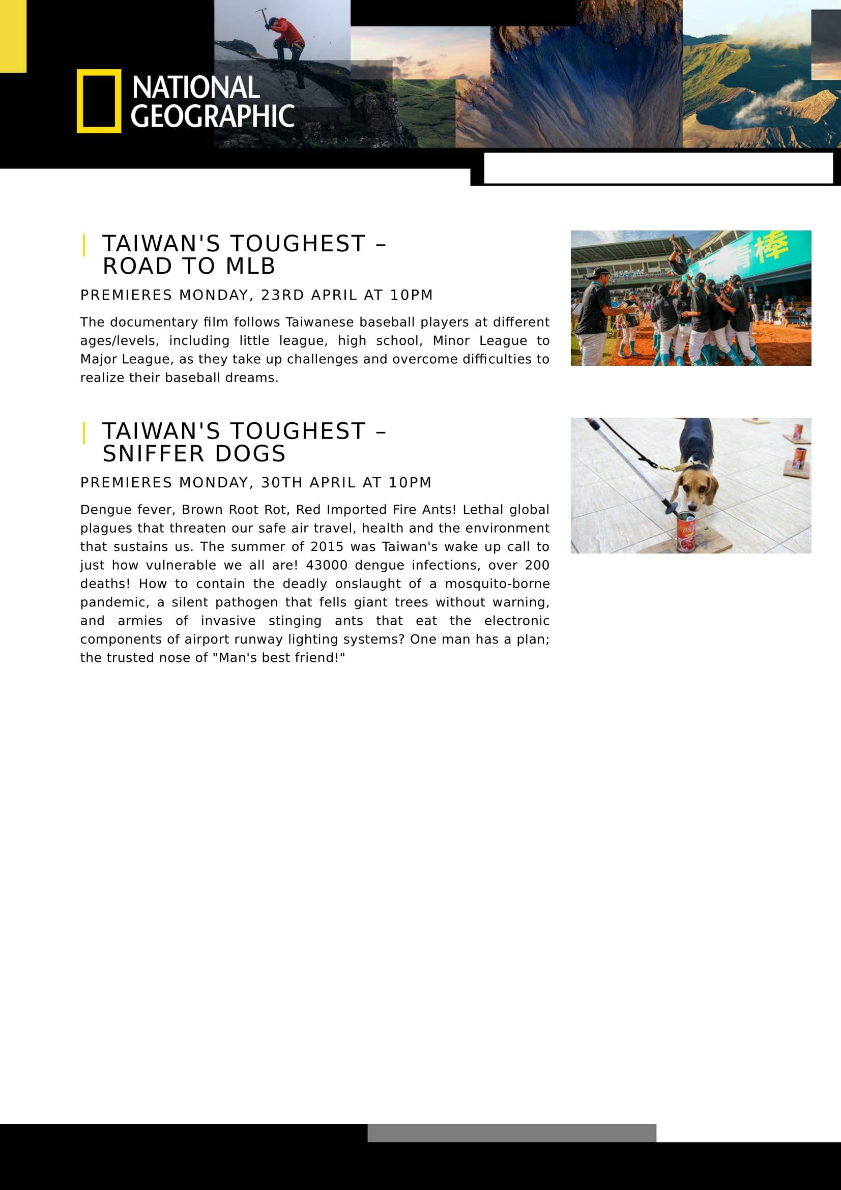 外交部與「國家地理頻道」(National Geographic Channel)合作製播之「綻放真臺灣6:終極英雄」(Taiwan to the World 6: Taiwan’s Toughest)紀錄片將於4月9日至5月1日在馬爾地夫播放。