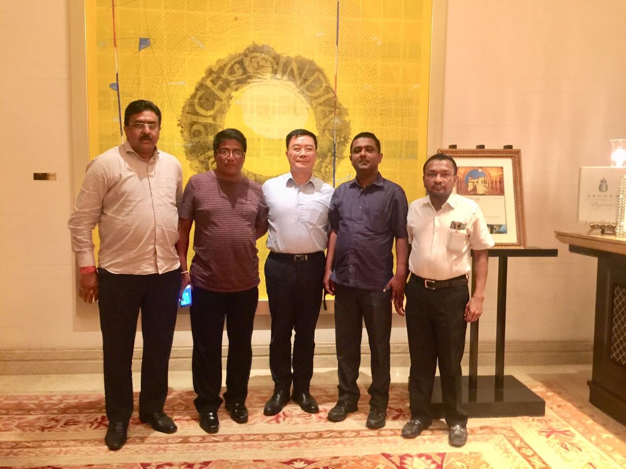 駐清奈辦事處李朝成處長(中)、斯里蘭卡第二大城市Dehiwal Mt. Lavinia市Stanley Dias市長(左二)、該市Dammika Muthugala執行長(右二)、印商Inspiredge執行長Sumit Bothra(右)、Govind Kumar(左)