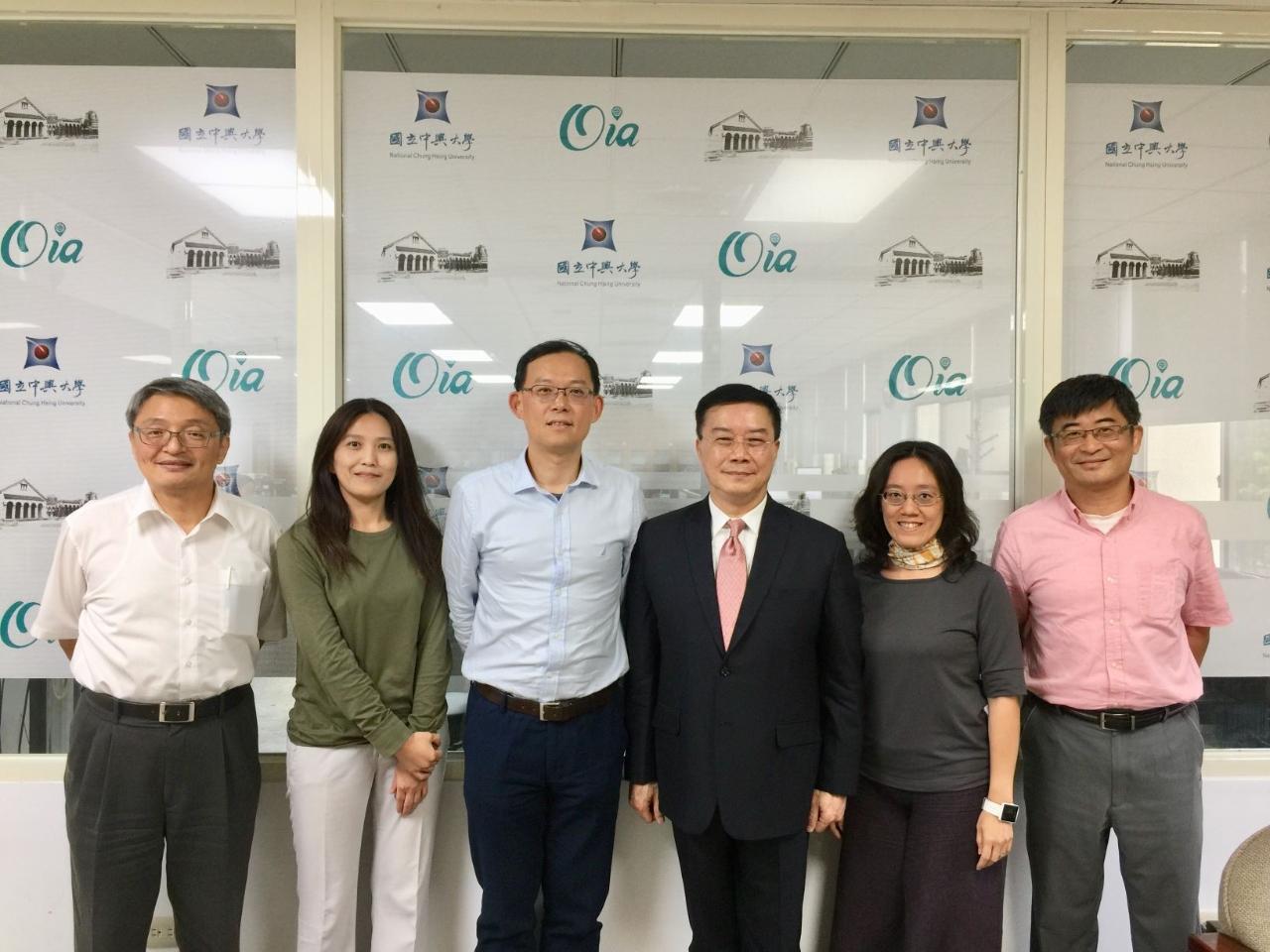 駐清奈辦事處李朝成處長(右三)、國立中興大學國際長陳牧民教授(左三)、動物科學系陳志峰主任(右一)、副國際長紀凱容副教授(右二)、動物科學系譚發瑞教授(左一)、國際事務處學術交流組陳姿伶組長(左二)