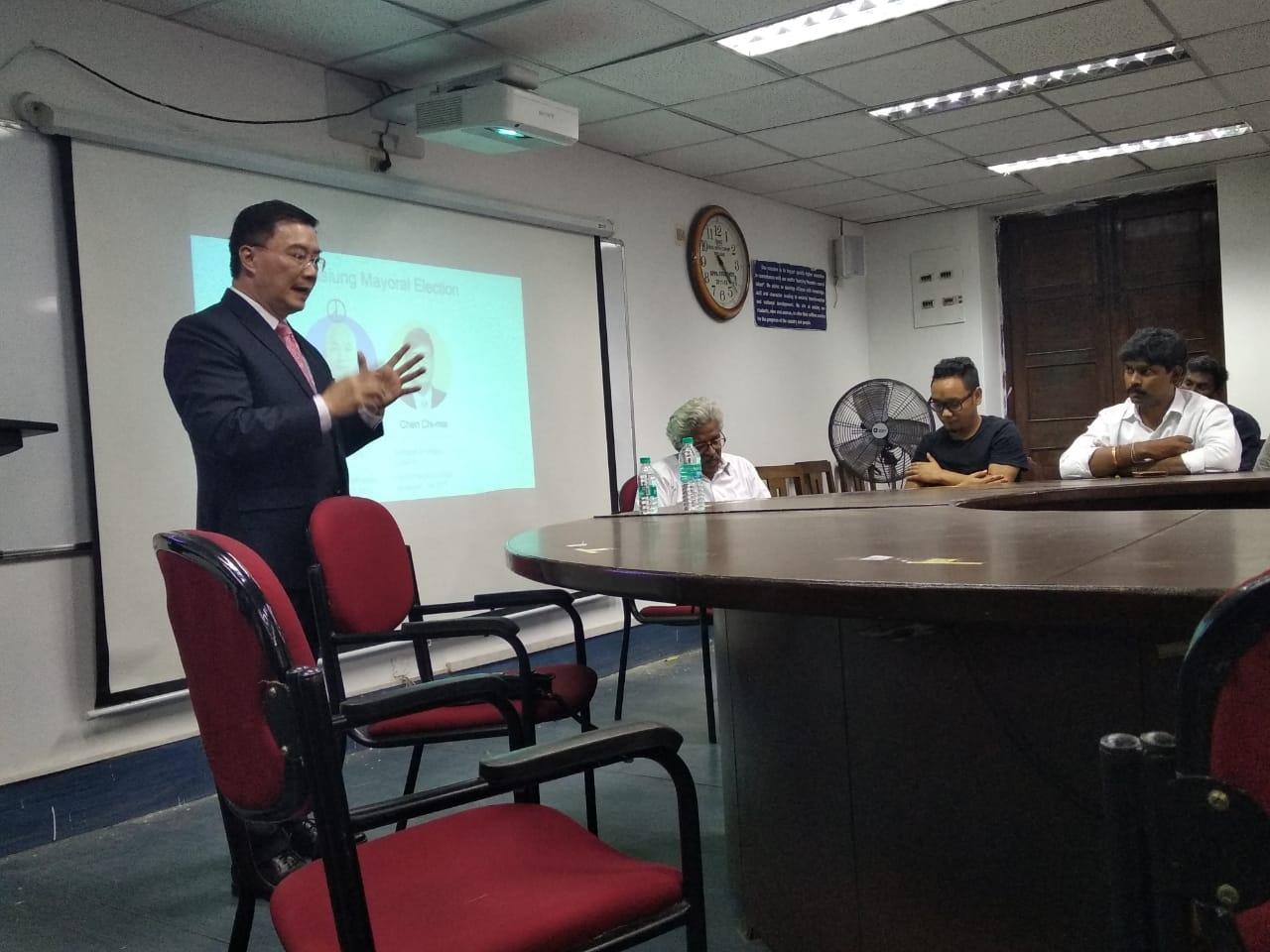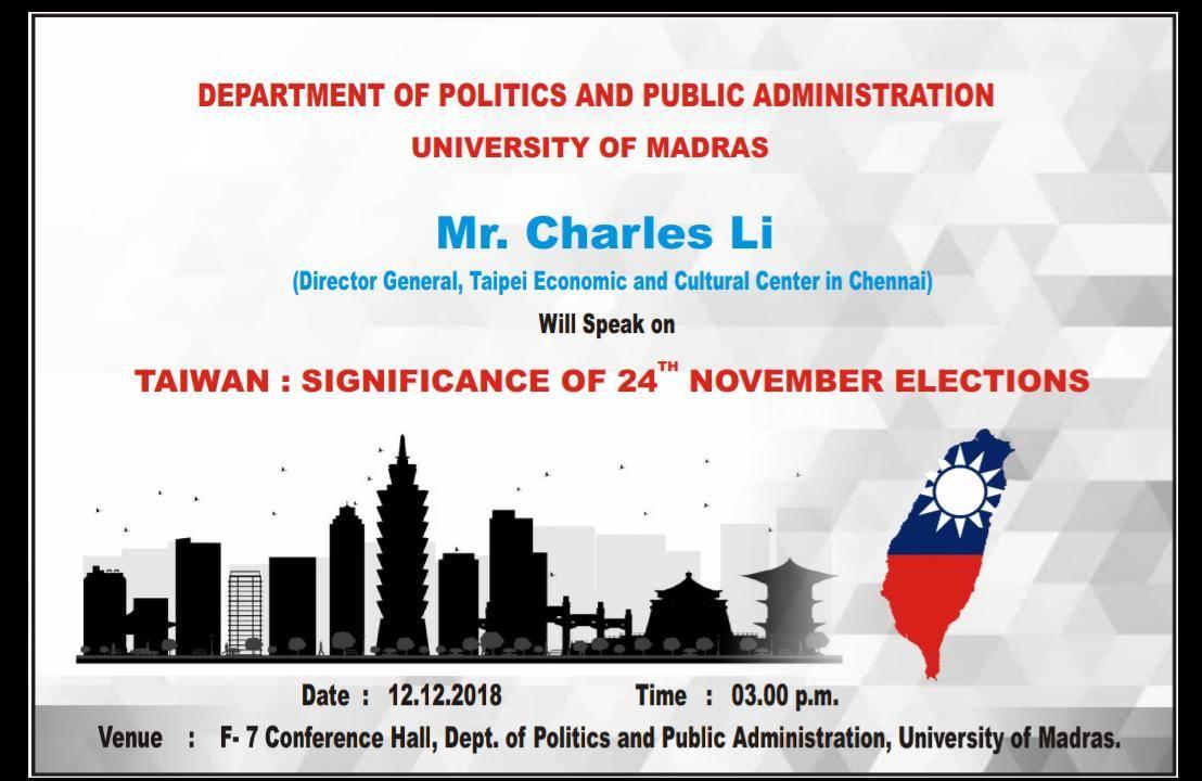 駐清奈辦事處李朝成處長應馬德拉斯大學政治暨公共行政系系主任安沐(Professor Ramu Manivannan)之邀,就11月24日臺灣舉行九合一選舉之意涵發表演說。