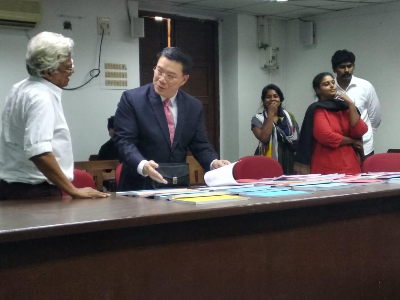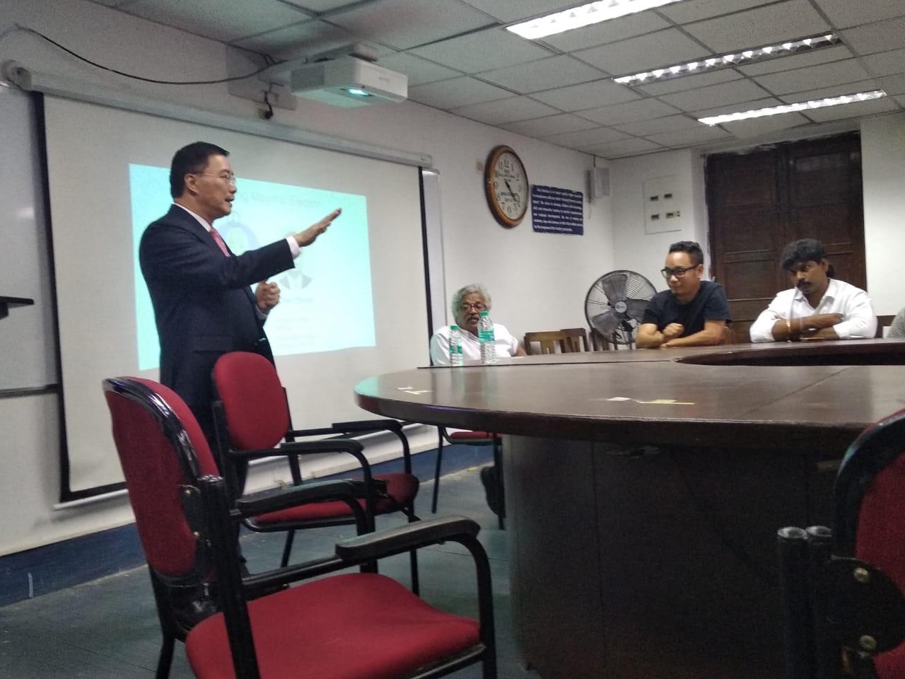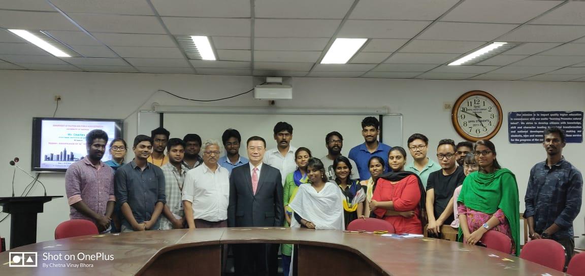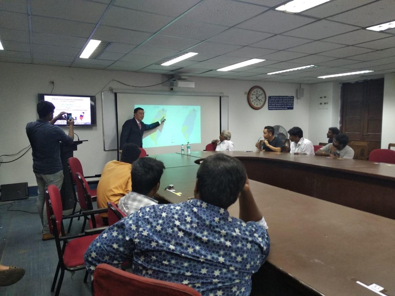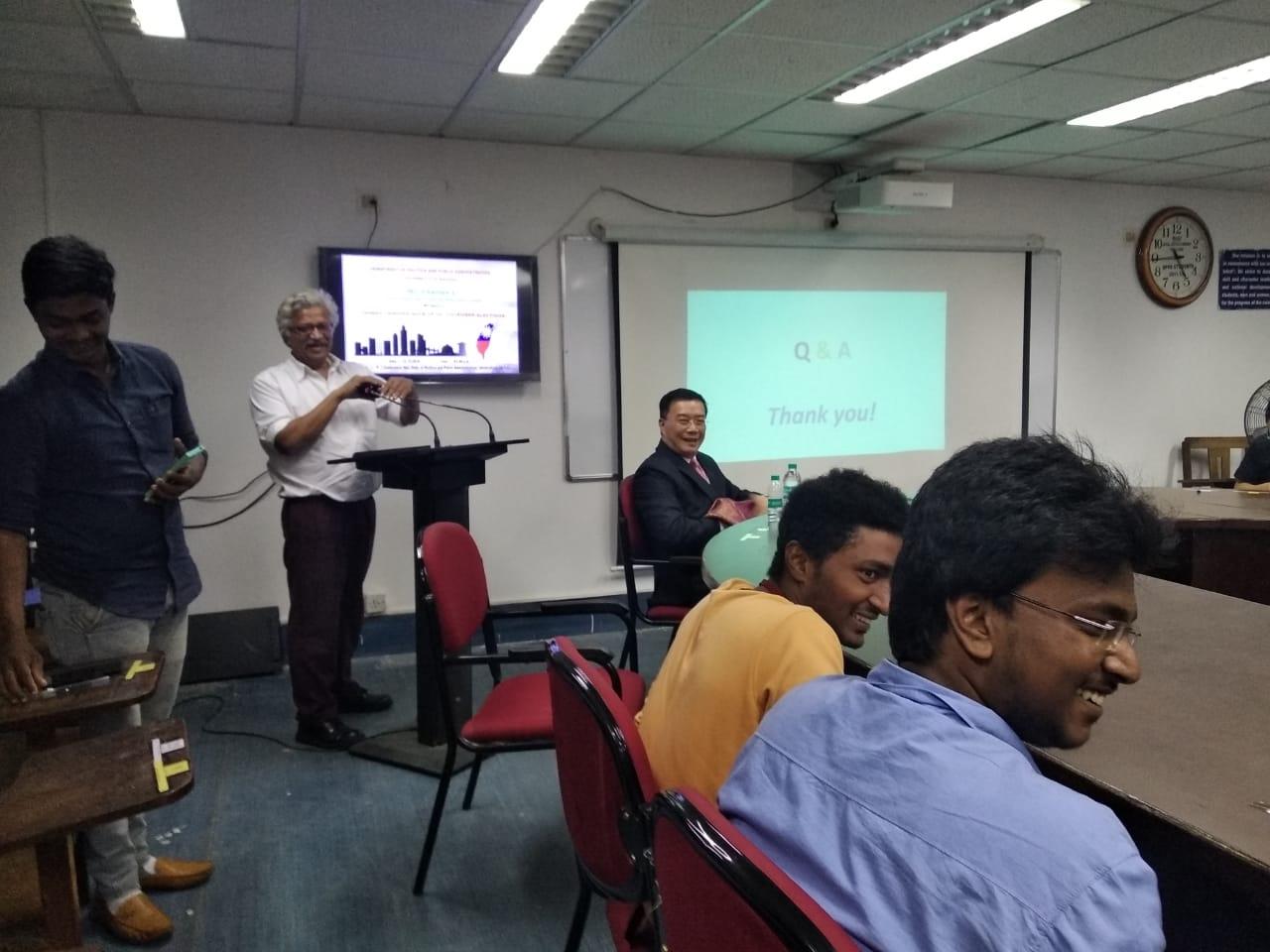 駐清奈辦事處李朝成處長12月12日下午應馬德拉斯大學(University of Madras)政治暨公共行政系(Department of Politics and Public Administration)系主任安沐(Professor Ramu Manivannan)之邀,就11月24日臺灣舉行九合一選舉之意涵發表演說,並答覆現場教授、博、碩士生之詢問,氣氛熱烈。