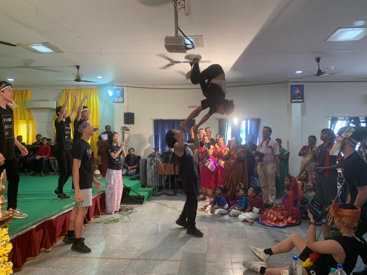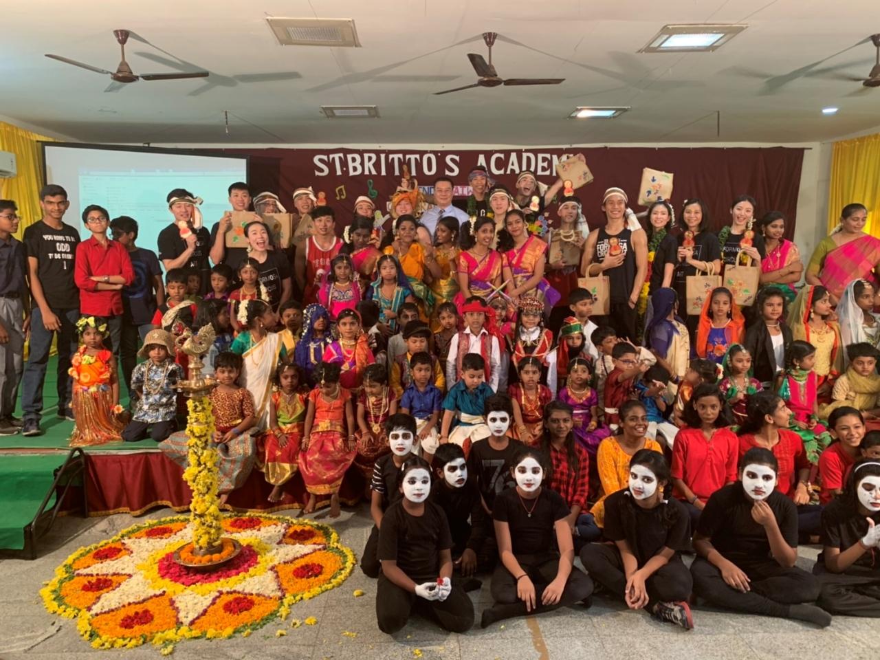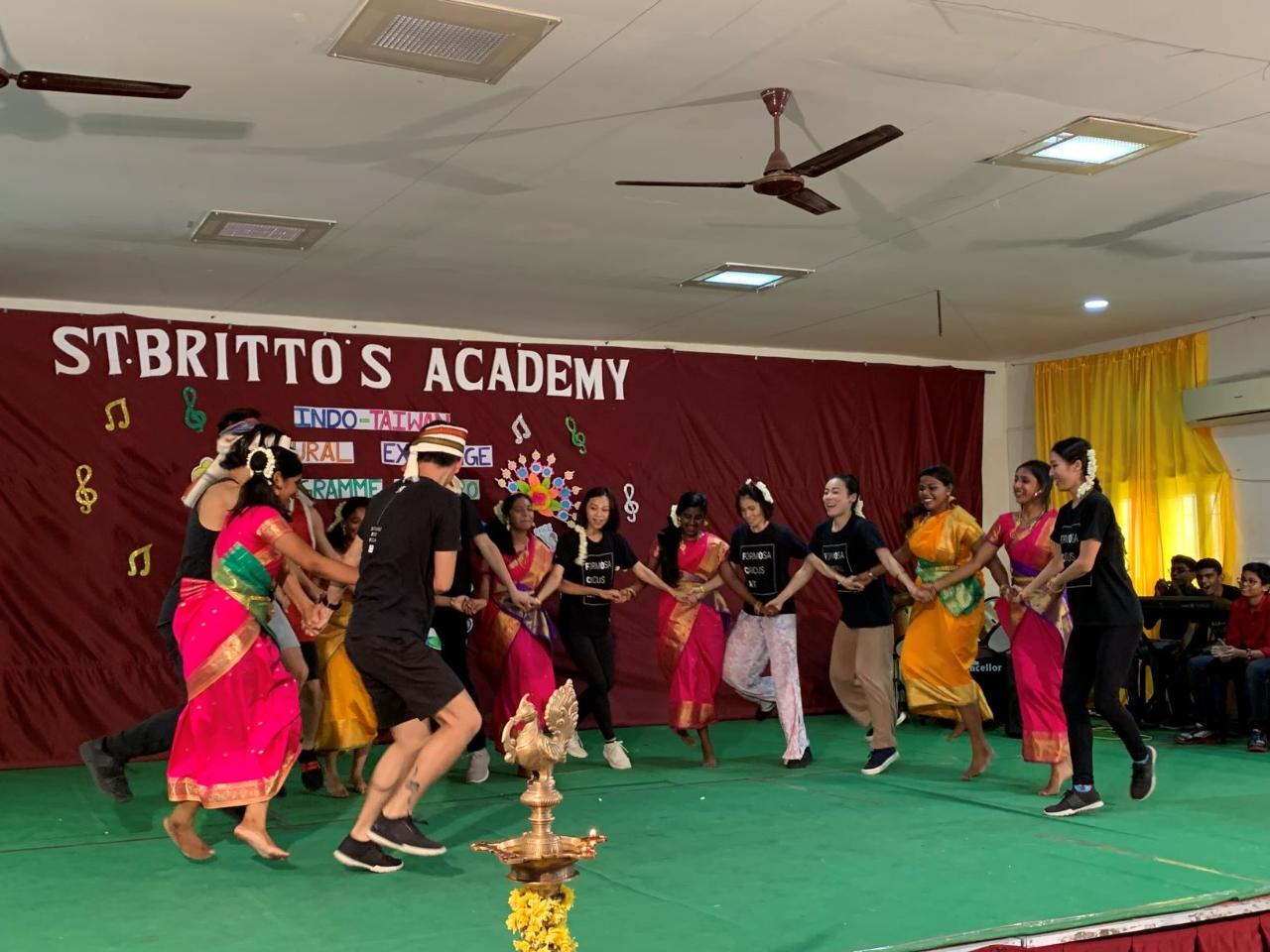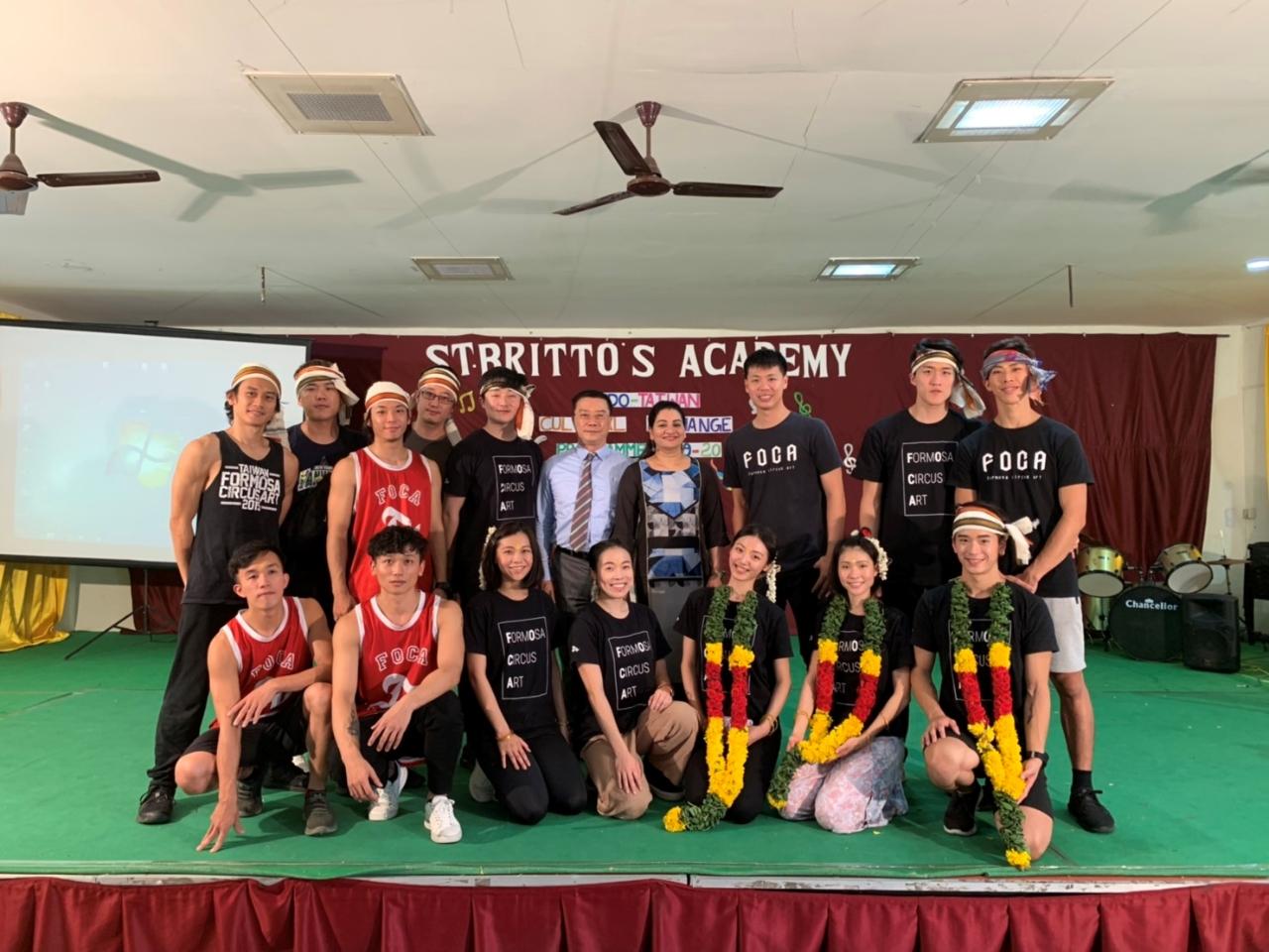 駐清奈辦事處7月3日上午安排來訪的FOCA福爾摩沙馬戲團與印度清奈聖布里托學校(St. Britto's Academy)進行文化藝術交流。校長Mary Kumari率師生代表熱烈歡迎。FOCA福爾摩沙馬戲團全體團員對該校注重學生對印度文化藝術教育的成果印象深刻。該校自幼兒園至高中的學生普遍均對印度歷史、藝術等傳統文化中的舞蹈、音樂有深入理解,而且強調英文與泰米爾文教育,隨時可與世界接軌。校方準備多元文化節目包括:現代歌曲、傳統舞蹈、各州服飾及南印度美食,訪團成員熱烈參與交流學習,氣氛熱烈。尤其帽子戲法、高空特技及團體舞,都獲得滿堂彩,交流收穫滿滿,賓主盡歡。