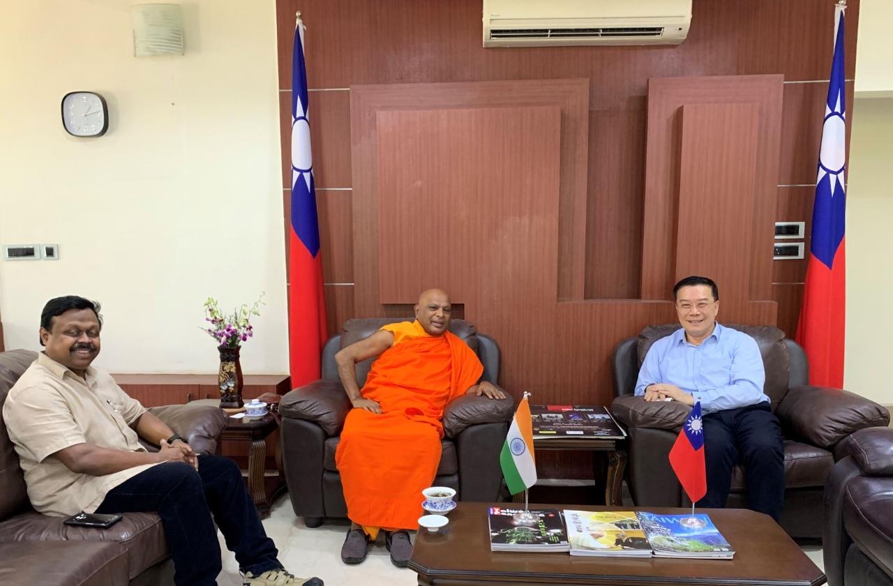 駐清奈辦事處李朝成處長(右)接待印度摩訶菩提協會會長上座佛教大法師Dr. D. Rewatha Nayaka Thero(中)及副會長Roshan Wijesekera(左)