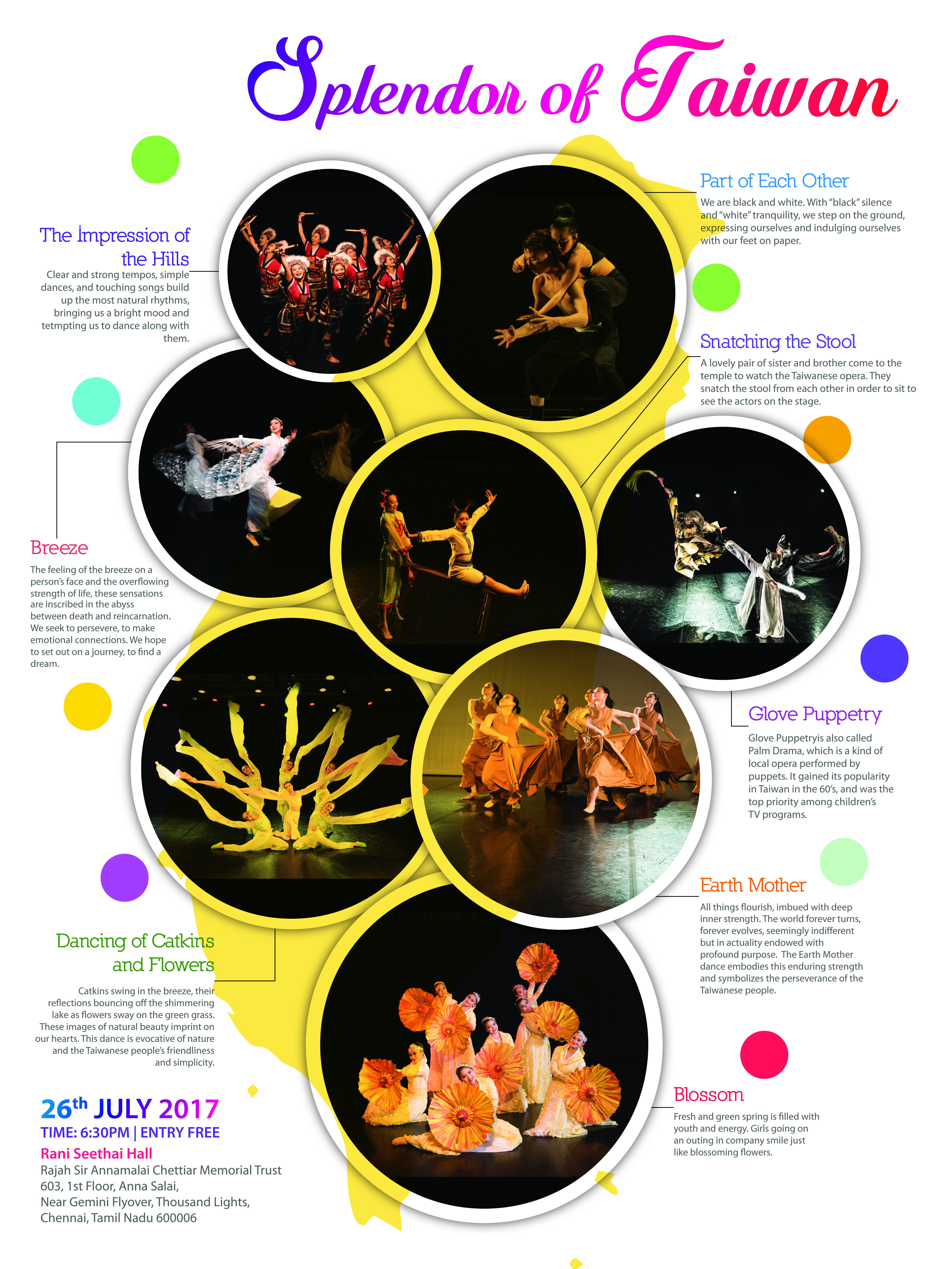 Dance performance "Splendor of Taiwan" on 26th July 2017 at Rani Seethai Hall, Free Entry