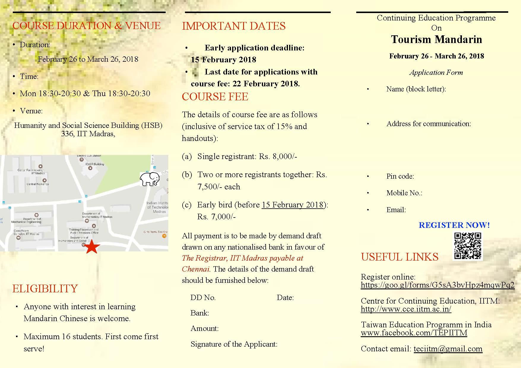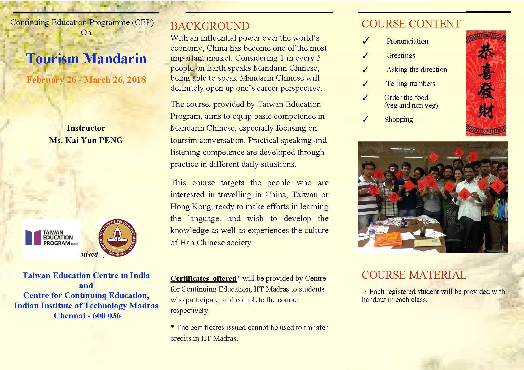 Tourism Mandarin course at Taiwan Education Center, IIT-M from 26th Feb to 26th March 2018.