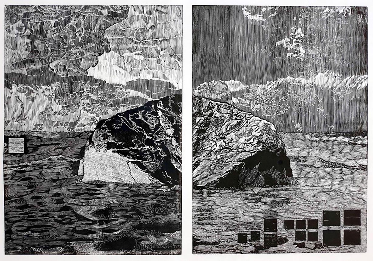 圖2-藝術家曾美禎木口木刻版畫於2016年獲英國皇家版畫協會「最佳藝術作品-〈紋字風景系列:雙〉(Landscape of Words-Twins)