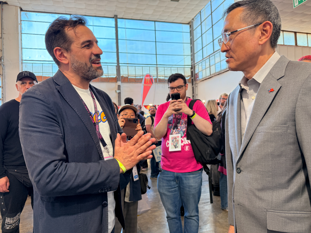 駐義大利代表處文化組表示,疫情後漫畫已成為義大利年輕世代接觸外國文化的最主要載體,連續3年參展北義盧卡漫畫節奠定臺漫於義大利漫畫界知名度,本次首度進軍南義拿坡里,除地理南向推進,更是「由點成線」的文化策略。未來將持續結合國內漫畫創作界、出版界資源,深化漫畫、童書、繪本、圖文出版等圖像文化於義大利品牌能見度,以促進版權出口與創作能量國際化。2025拿坡里漫畫節參與人數爆棚,臺灣館所在亞洲村展區人潮洶湧 臺灣館現場工作人員向義國讀者熱情解說 駐義大利代表處蔡允中大使(右)與拿坡里漫畫節主席古魯丘(左)就未來持續設置臺灣館推廣臺漫深具共識 Taiwan Comics開幕茶會安排2位參展漫畫家現場簽繪(左一站立者為駐義大利代表處蔡允中大使)