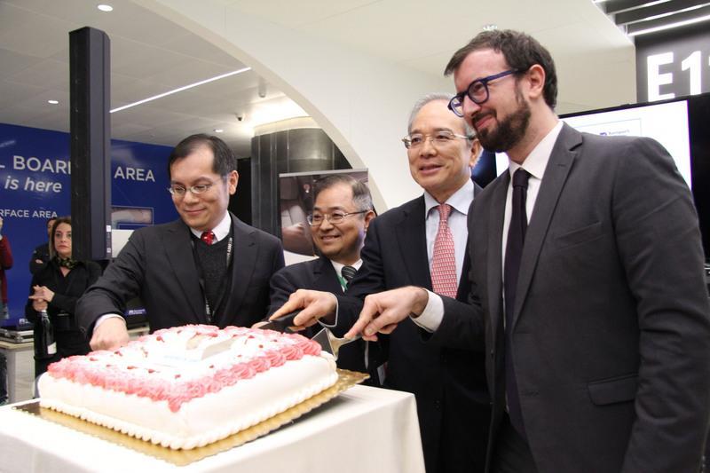 華航直飛羅馬啟用空中巴士A350新機型,7日舉行慶祝 儀式,中華民國駐教廷大使李世明(右2)、駐義大利 副代表謝俊得(左2)、華航義大利分公司總經理蕭炘 增(左1)皆出席。 中央社記者黃雅詩羅馬攝 106年2月8日