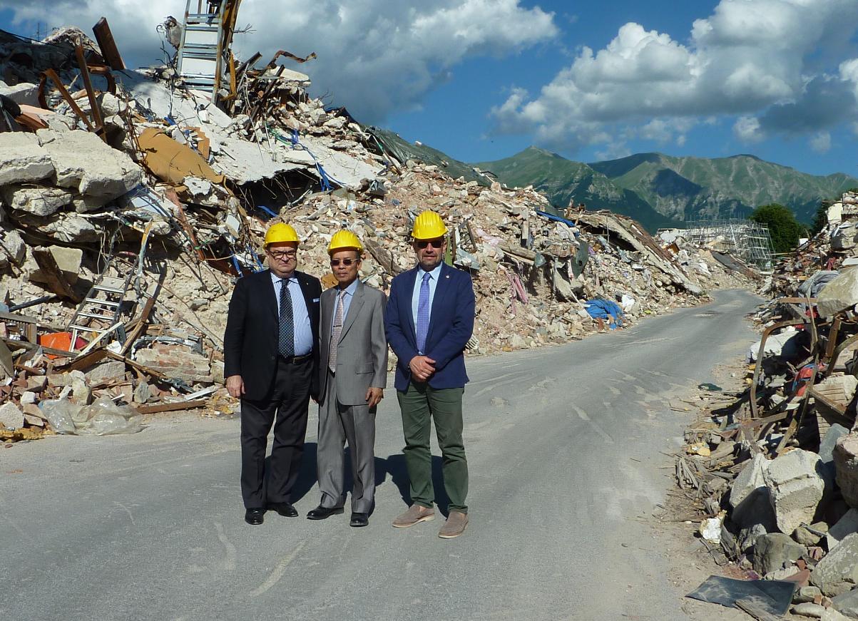 侯大使(中)、Arrigoni參議員(右一)、Zuccoli秘書長(左一)訪視災區Amatrice市