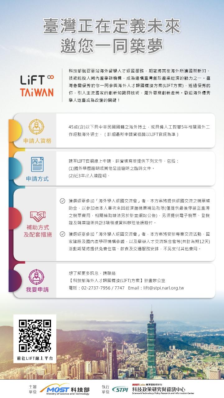 為促進海外學人加速瞭解臺灣產業現況及國內高階人才需求期盼並達成返國服務之目的下,搭建一系列的延攬海外高階人才(博士級或同等)返國之交流媒合平台,科技部自去年起即推出LIFT方案,吸引並協助海外人才返國貢獻所長。今年科技部再度推出LIFT2.0方案,獲核定同意補助返台之學人,將可獲得來回台灣經濟艙機票,以返國參與為期12天之「海外學人返國交流會」系列活動,期間食宿及交通等相關費用將由科技部專案辦公室統籌安排。歡迎各位符合資格之海外學人踴躍報名參加。