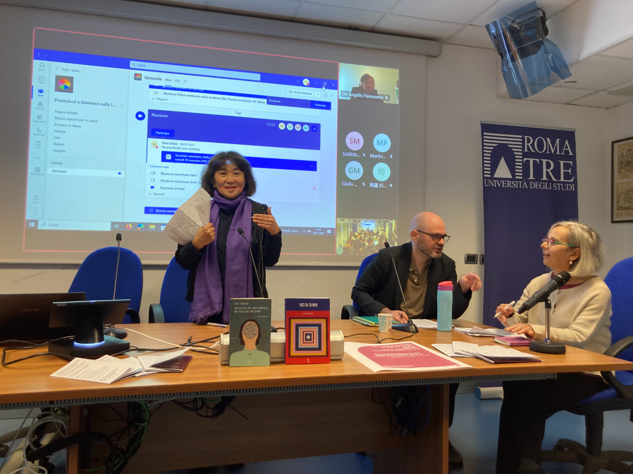 La scrittrice Chu Tien-hsin si rivolge al pubblico di lettori. Accanto a lei la Prof.ssa Rosa Lombardi, referente del progetto e moderatrice dell’incontro, e il prof. Sergio Conti, interprete.