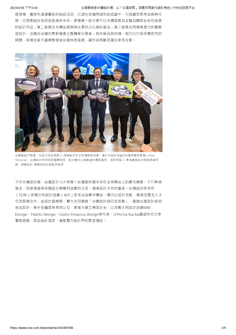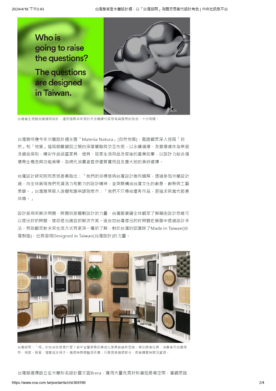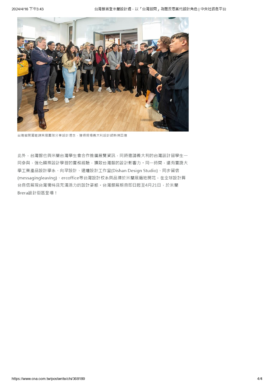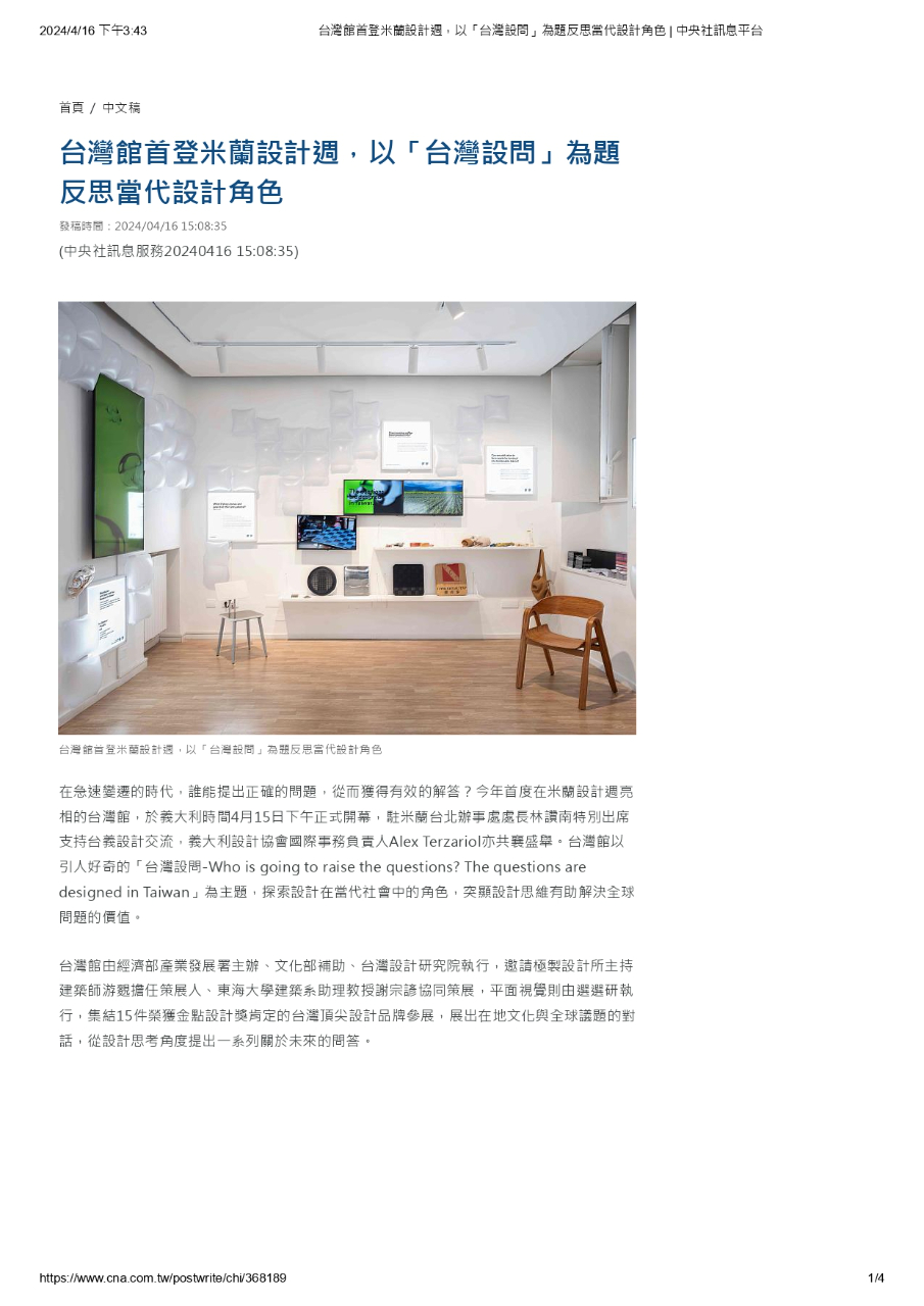 台灣館首登米蘭設計週,以「台灣設問」為題反思當代設計角色 _ 中央社訊息平台_page-0001 台灣館首登米蘭設計週,以「台灣設問」為題反思當代設計角色 _ 中央社訊息平台_page-0002 台灣館首登米蘭設計週,以「台灣設問」為題反思當代設計角色 _ 中央社訊息平台_page-0003台灣館首登米蘭設計週,以「台灣設問」為題反思當代設計角色 _ 中央社訊息平台_page-0004