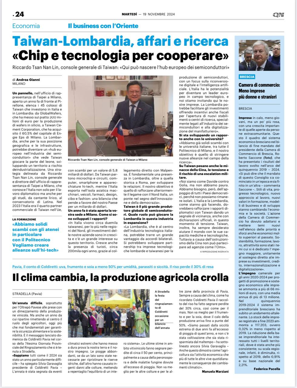駐米蘭辦事處林讚南處長於設處滿一週年之際,接受義大利「日報」專訪,該報並以「台灣-倫巴底:產業與研究-晶片與科技之合作(Taiwan-Lombardia, affair e ricercar «Chip e tecnologia per cooperare»)」為題刊登專訪內容。