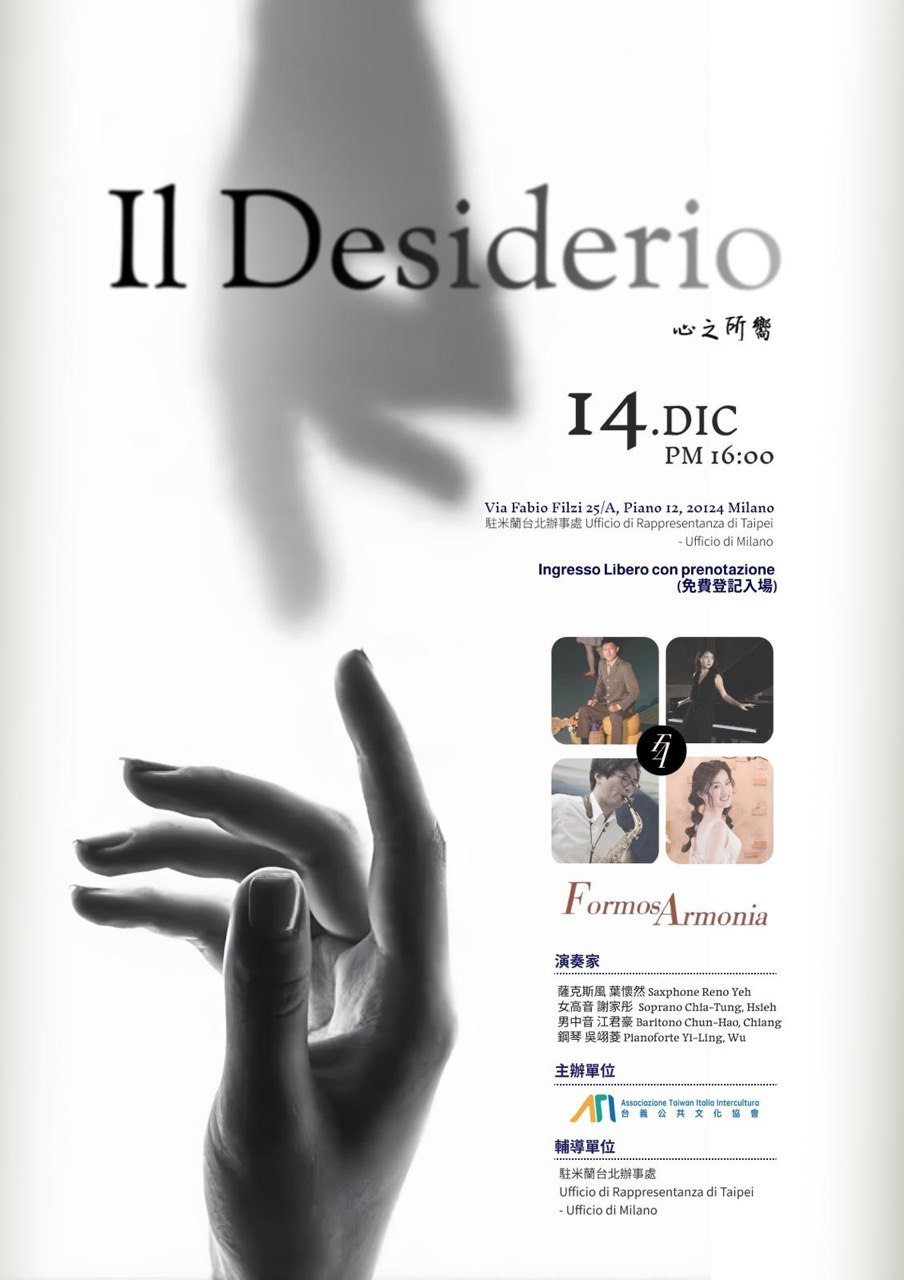 繼10月27日「愛的呢喃」音樂會廣獲各界好評,駐米蘭辦事處12月14日再度攜手台義公共文化協會 Associazione Taiwan Italia Intercultura (ATI),於12月14日下午在辦事處大廳舉辦「心之所嚮」音樂會,吸引超過80名義北僑界、商界及學界人士共襄盛舉,為深化台義文化交流再添新頁。