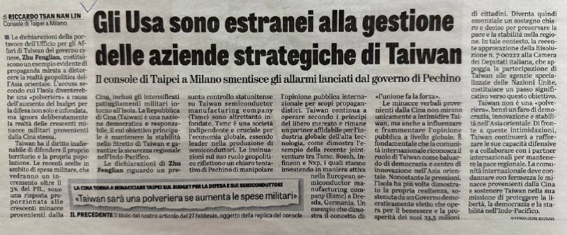 真理報3月2日以「美國無涉台灣戰略企業之管理(Gli Usa sono estranei alla gestione delle aziende strategiche di Taiwan)」為主標,以「駐米蘭台北總領事反駁北京政府言論(Il Console di Taipei a Milano smentisce gli allarmi lanciati dal governo di Pechino)」為副標刊登林處長投書,反駁中國就台灣政府提高國防預算及半導體議題,毫無根據宣稱台灣執政者增加國防預算導致台灣成為火藥庫,而半導體至美國設廠是為討好美國,罔顧台灣人民福祉。林處長投書反駁中國不當言論,以實例說明台灣是民主、負責任之國家,提升軍備首要目標是應對來自中國的威脅,維護台海穩定並確保印太地區之安全,同時作為全球高科技產業可靠之合作夥伴,台灣優秀的半導體產業是按照自由市場機制運作,以確保全球供應鏈穩定。