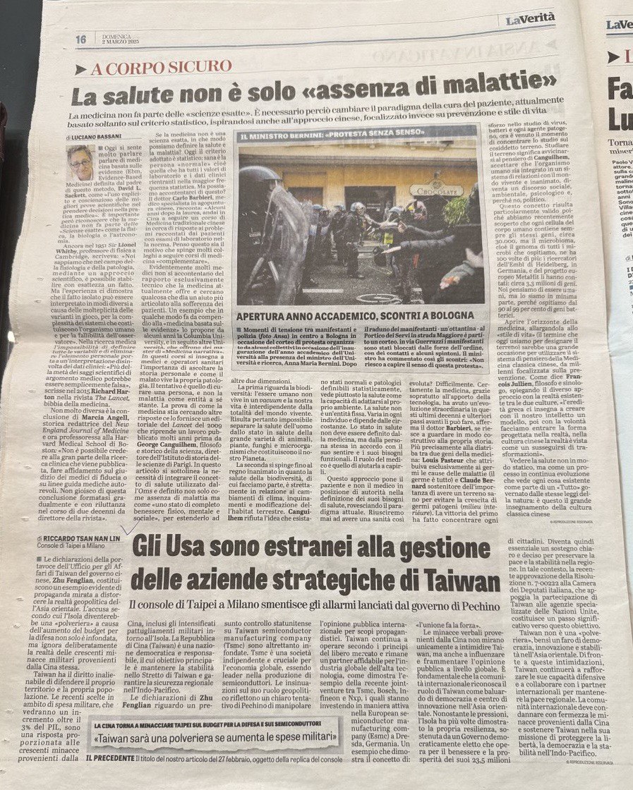 駐米蘭辦事處林讚南處長投書義大利真理報(La Verità)獲刊登 - 駐米蘭台北辦事處 Ufficio di Rappresentanza di Taipei in Italia-Ufficio di Milano ::: 跳到主要內容區塊