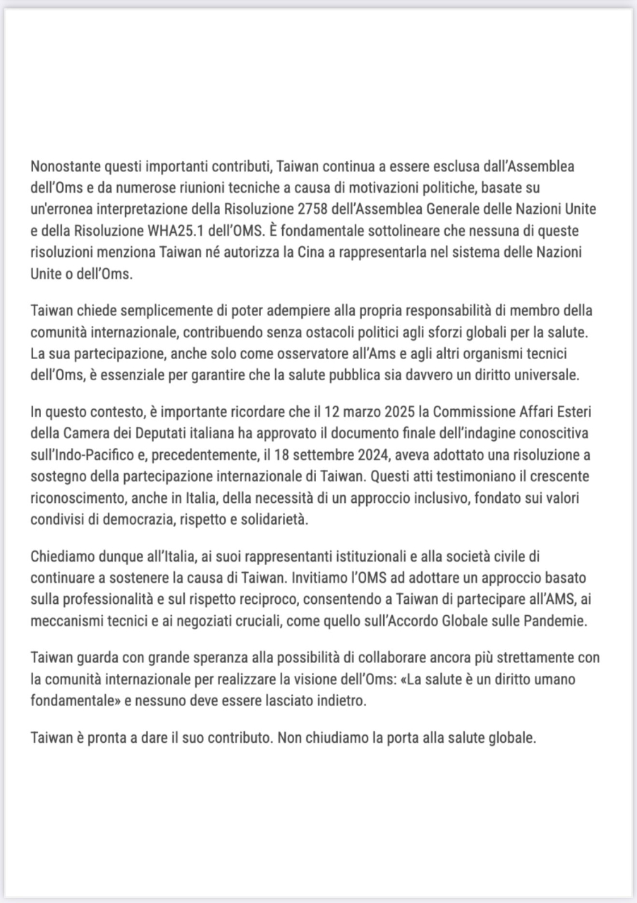 義大利眾議院外交委員會於2025年3月12日通過「有關義大利及其他歐洲國家在印太地區影響力」調查報告,此前,該委員會於2024年9月18日通過支持台灣參與國際事務的決議。我們希望義大利的機關代表和民間社會繼續支持台灣,呼籲WHO採取專業、尊重的做法,讓台灣參與WHA及專業技術會議。