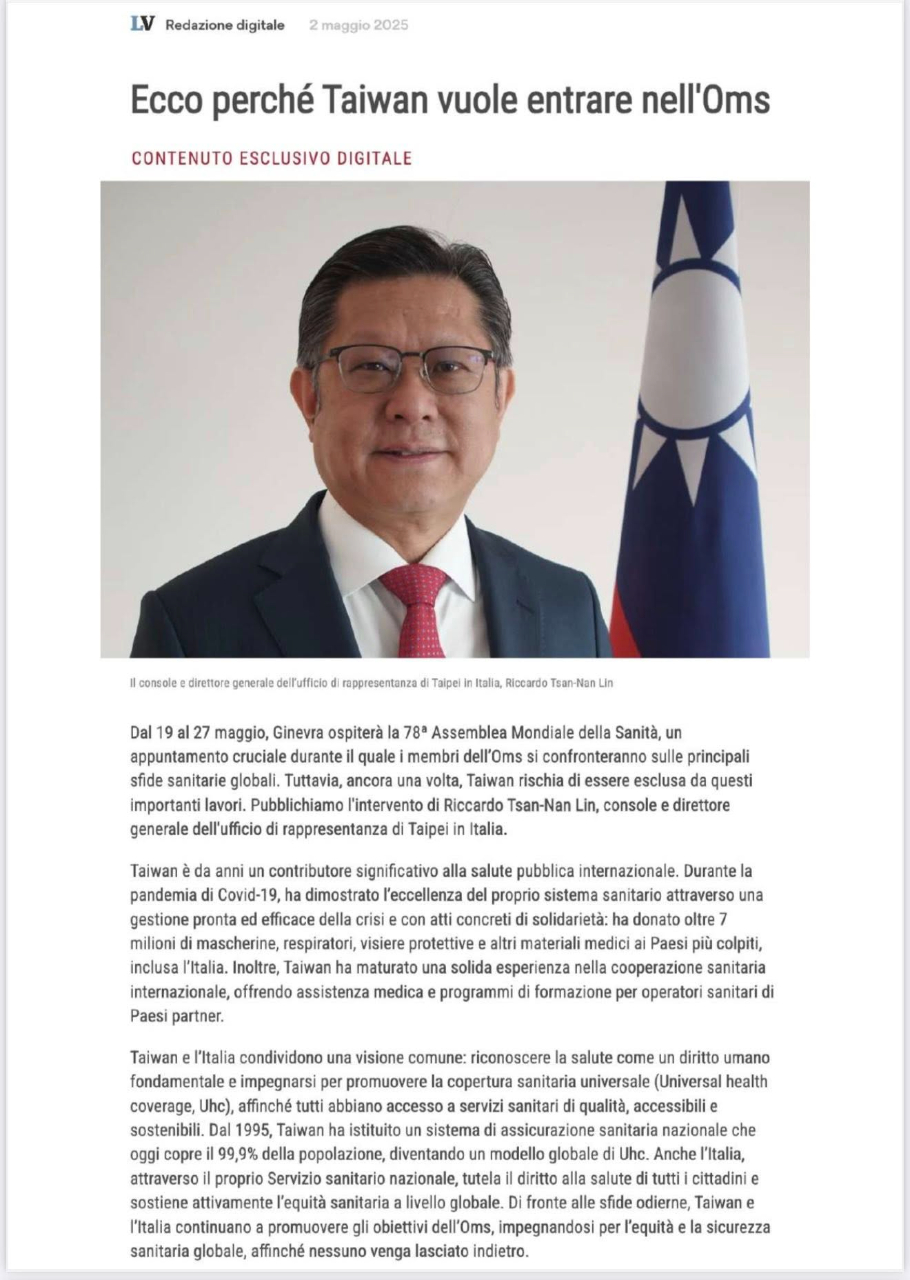 林處長投書專文獲義大利「真理報」(La Verità) 以「台灣盼加入WHO之理由(Ecco perché Taiwan vuole entrare nell’OMS)」為題全文刊登。